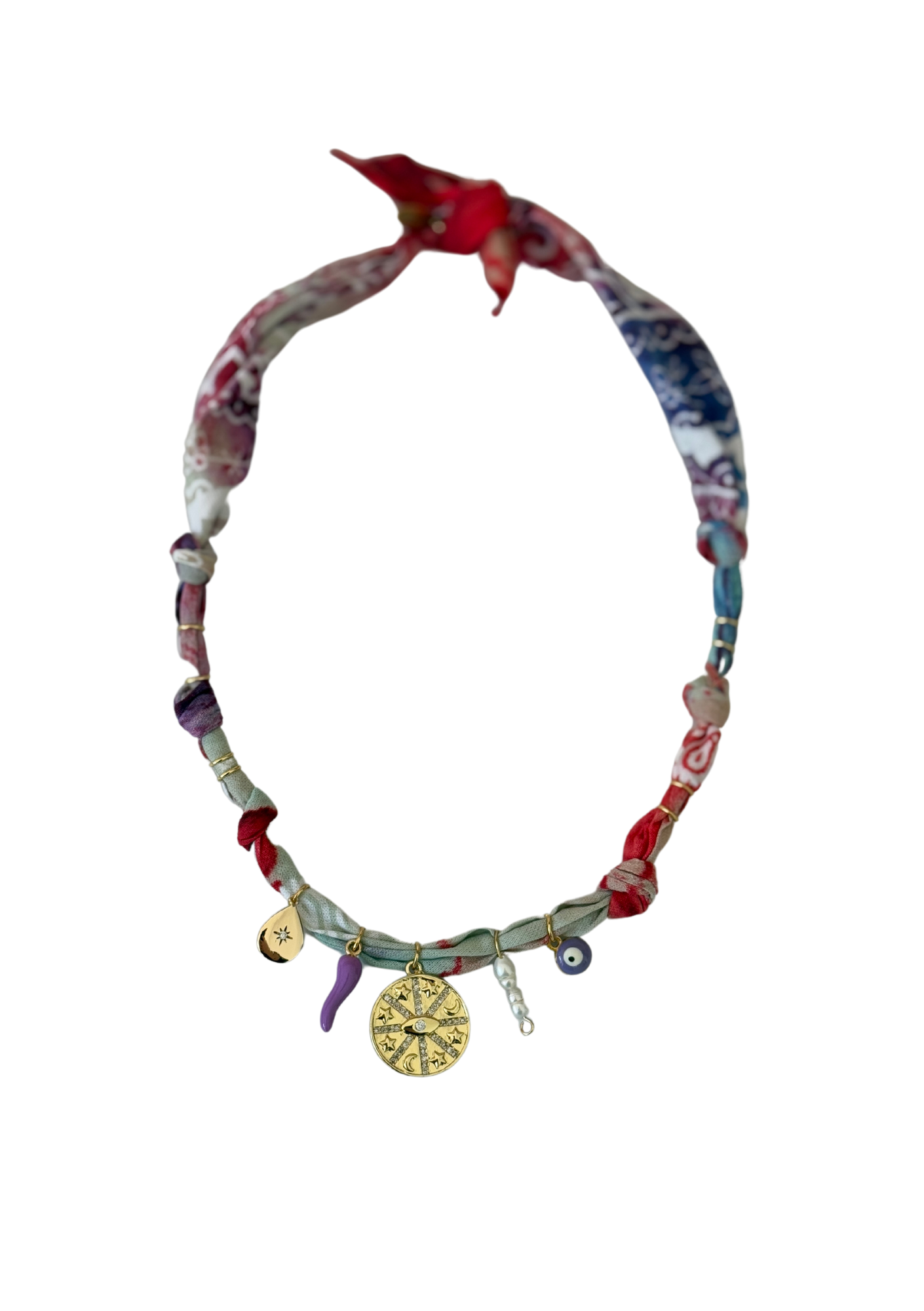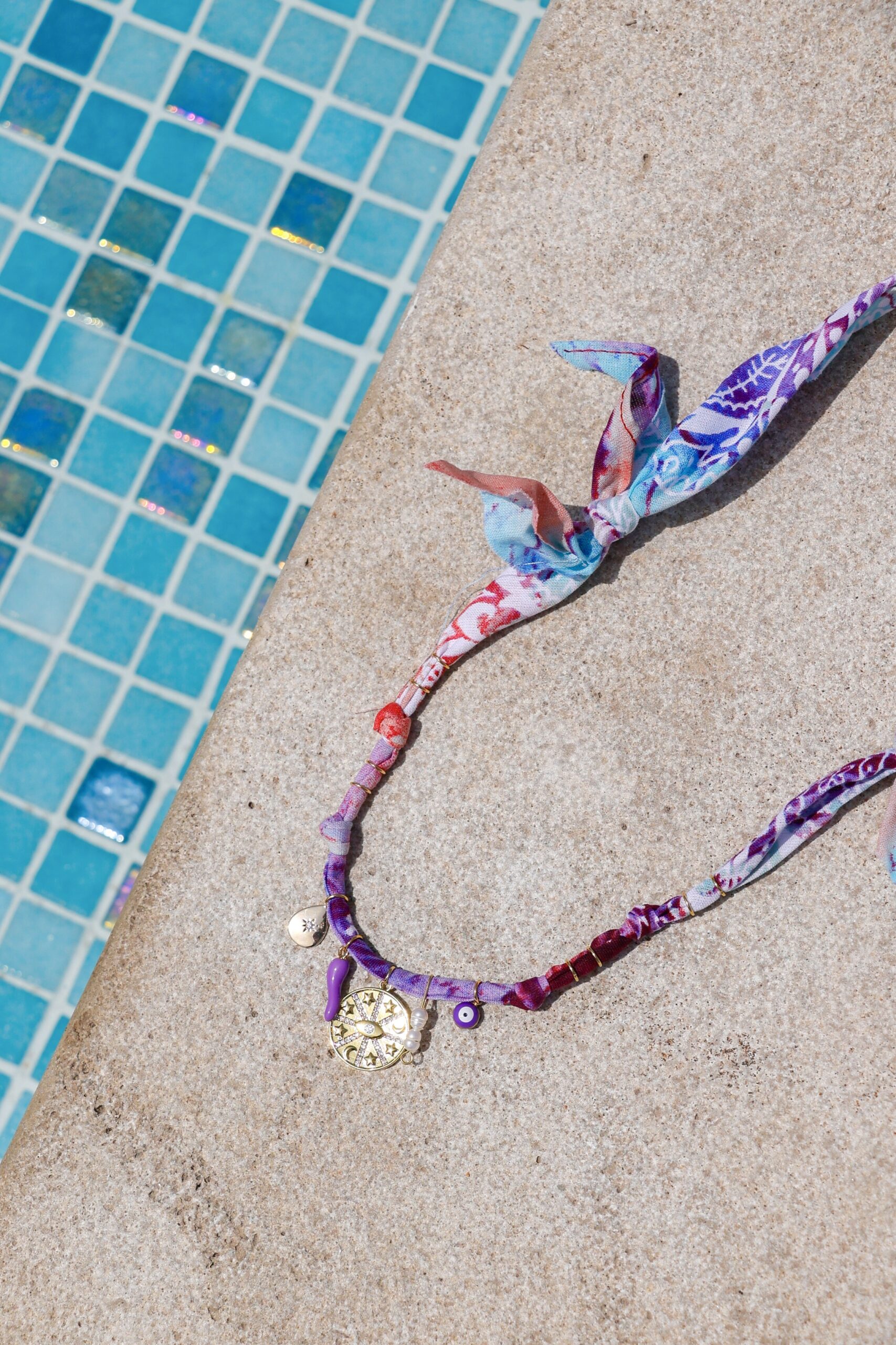 Du bandana au bijou, il n’y a qu’un pas : ce modèle polyvalent se porte en collier, bracelet ou bijou de cheville. En coton 100%, avec acier inoxydable et pierres naturelles.