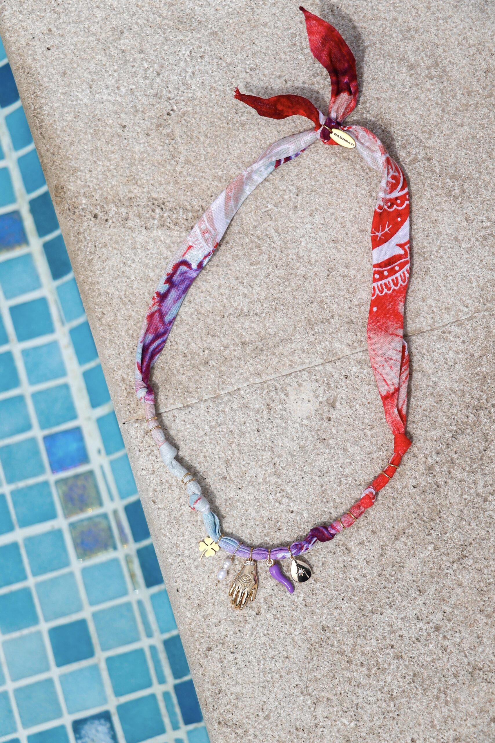 Collier, bracelet ou cheville : ce bijou inspiré du bandana s’adapte à toutes vos envies. Fabriqué en coton pur, orné d’acier inoxydable et pierres naturelles.