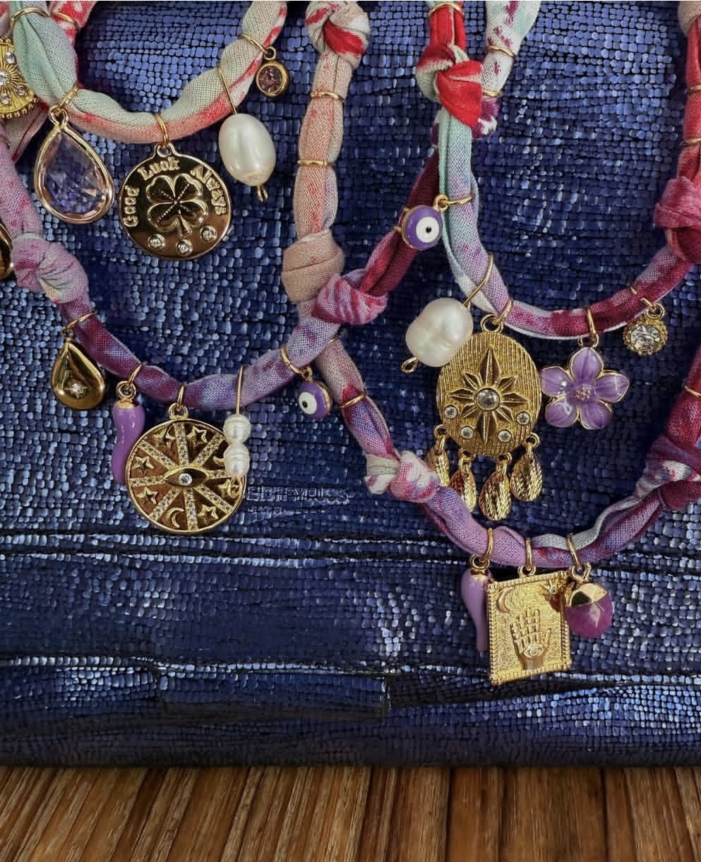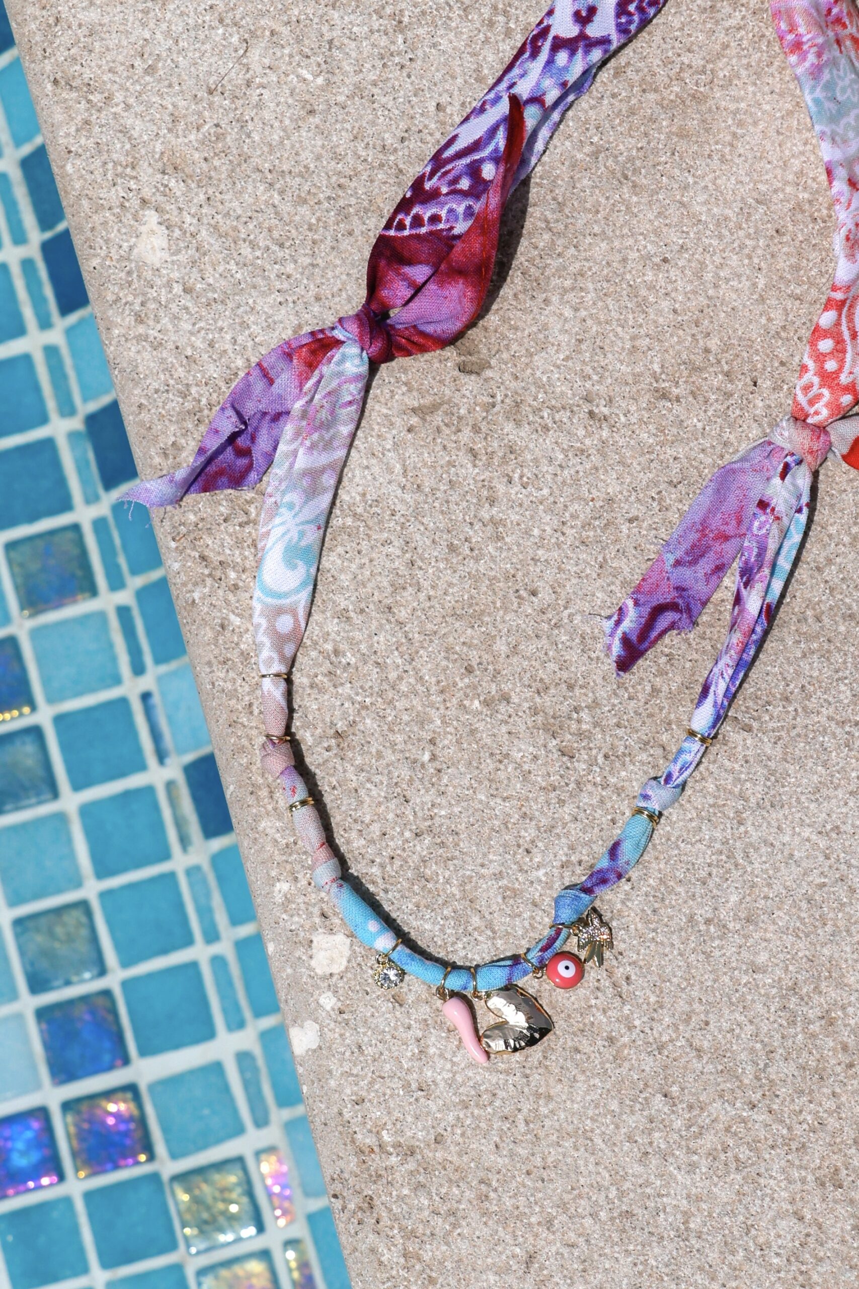 L’icône bandana revisitée en bijou modulable : collier, bracelet ou cheville. Coton 100%, motif acier inoxydable et pierres naturelles.