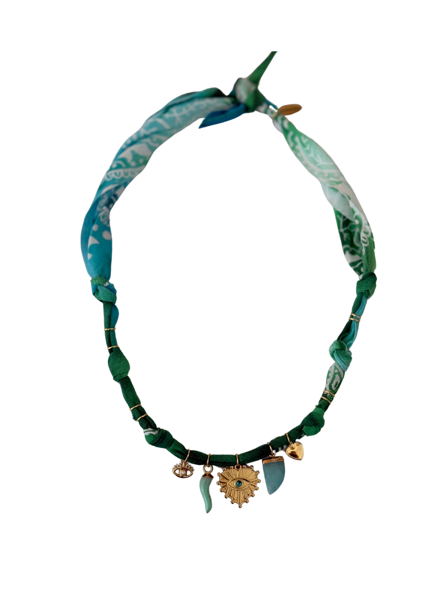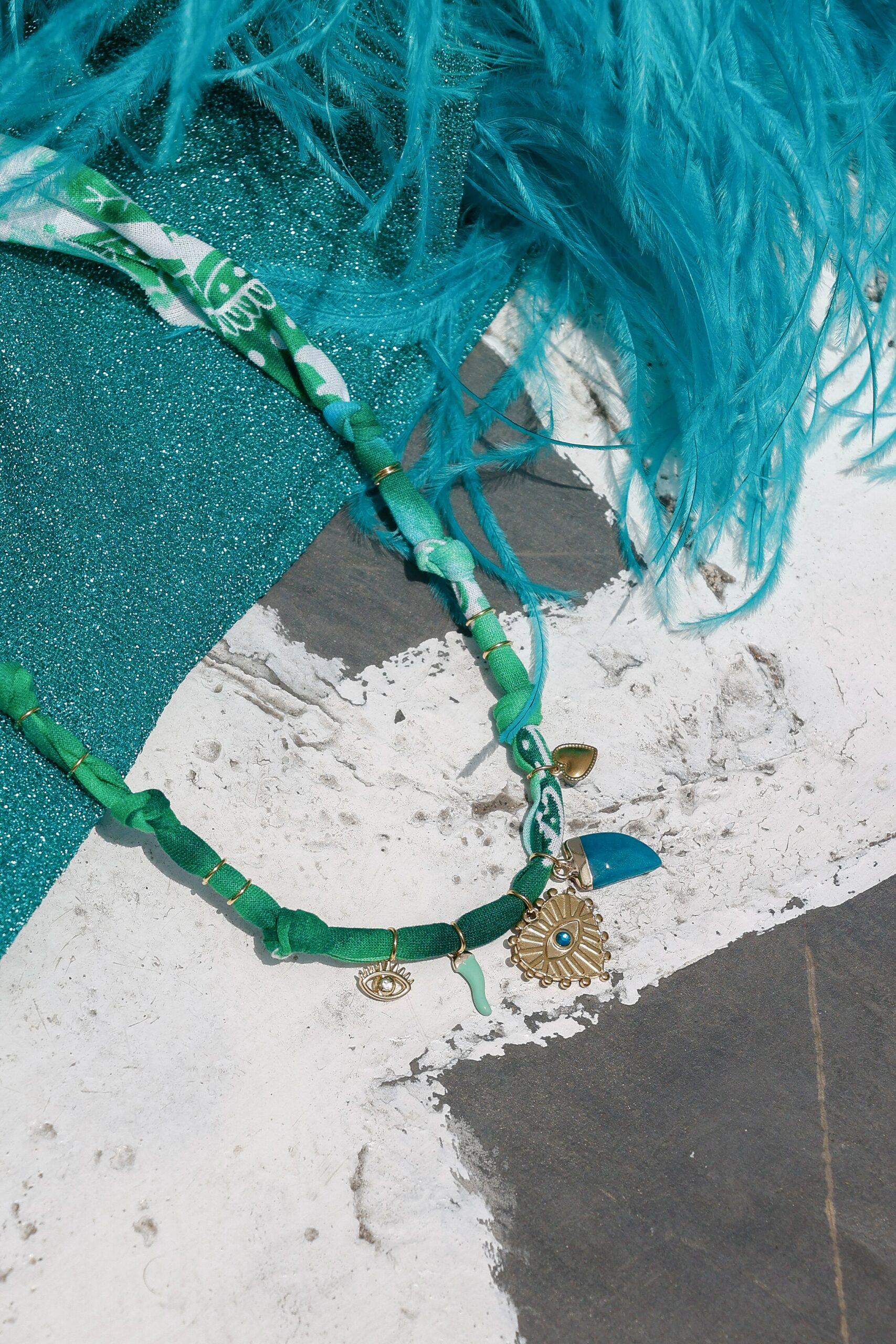 Trois façons de le porter, un seul bijou : bandana revisité en coton 100% et acier inoxydable avec pierres naturelles.