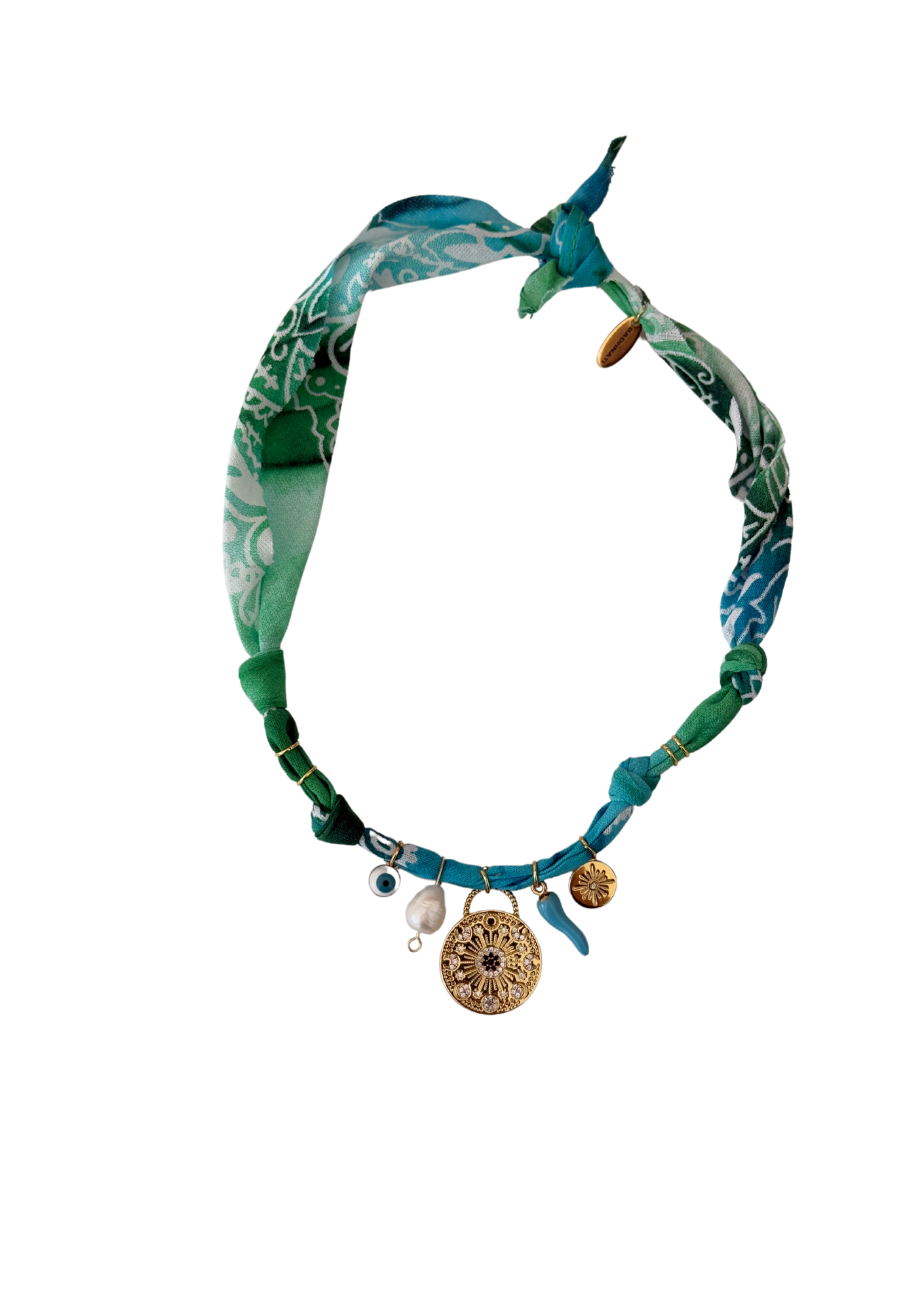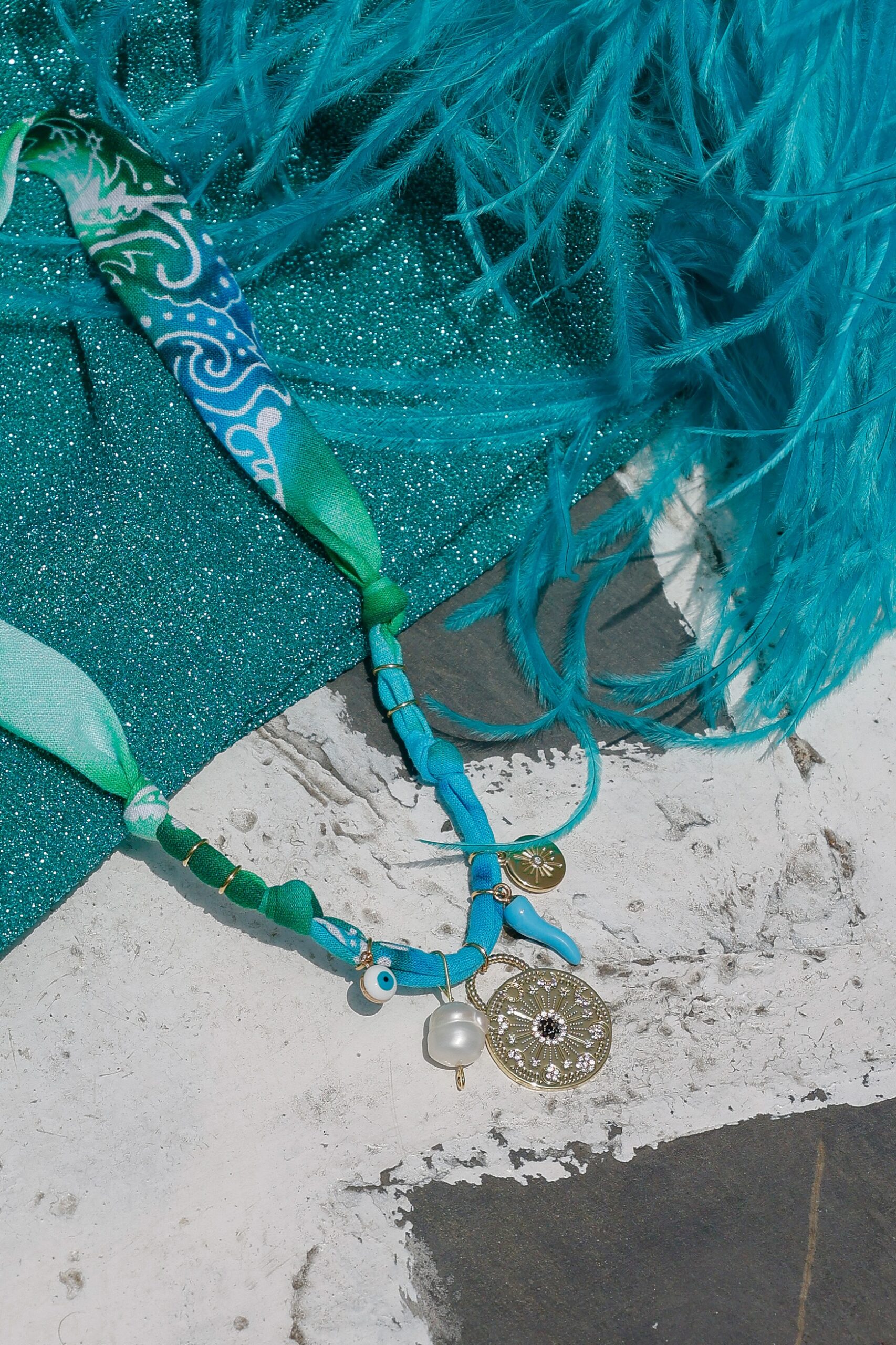 Bijou modulable inspiré du bandana : collier, bracelet ou cheville. Coton pur, acier inoxydable, pierres naturelles.