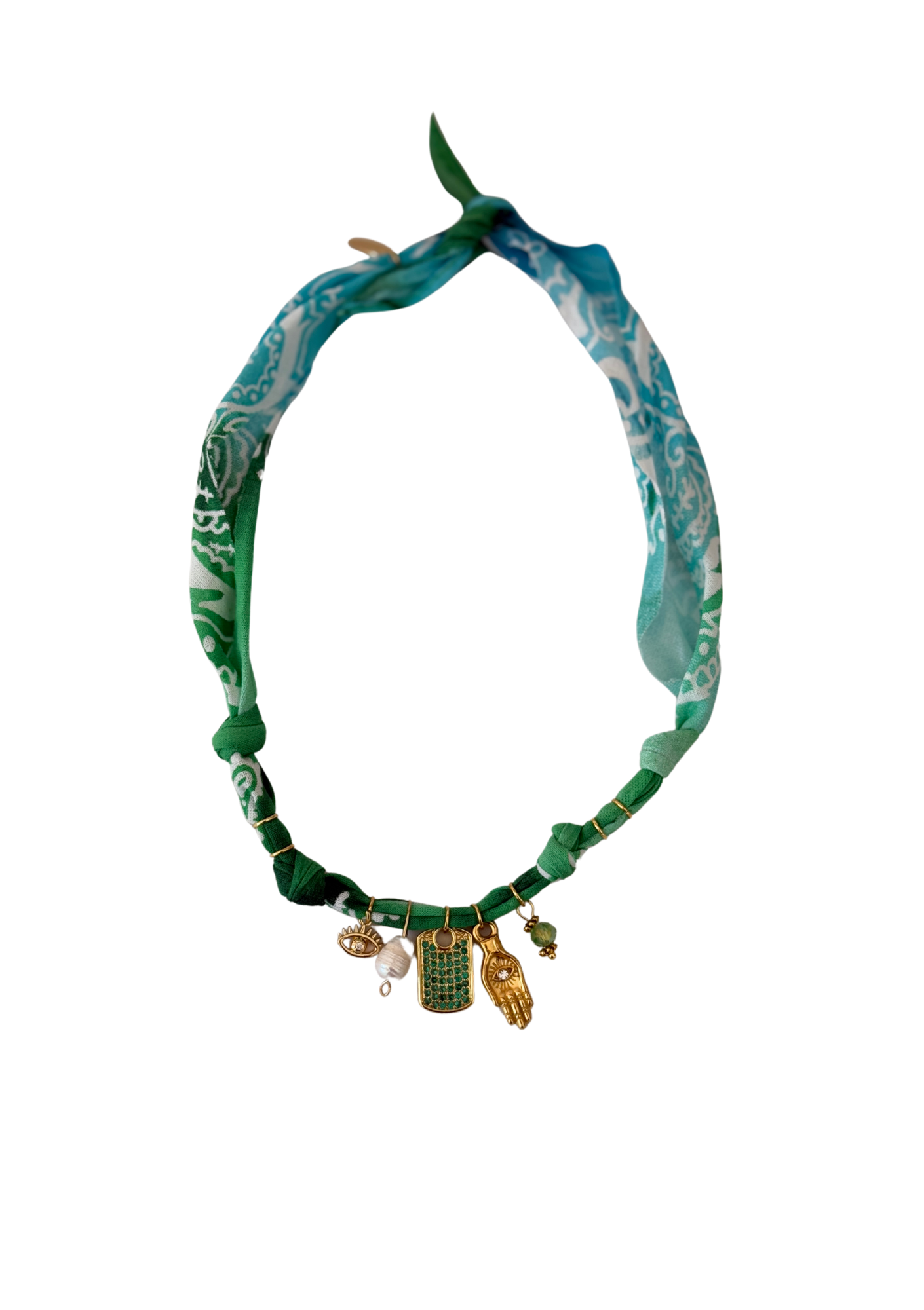 Bijou modulable inspiré du bandana : collier, bracelet ou cheville. Coton pur, acier inoxydable, pierres naturelles.