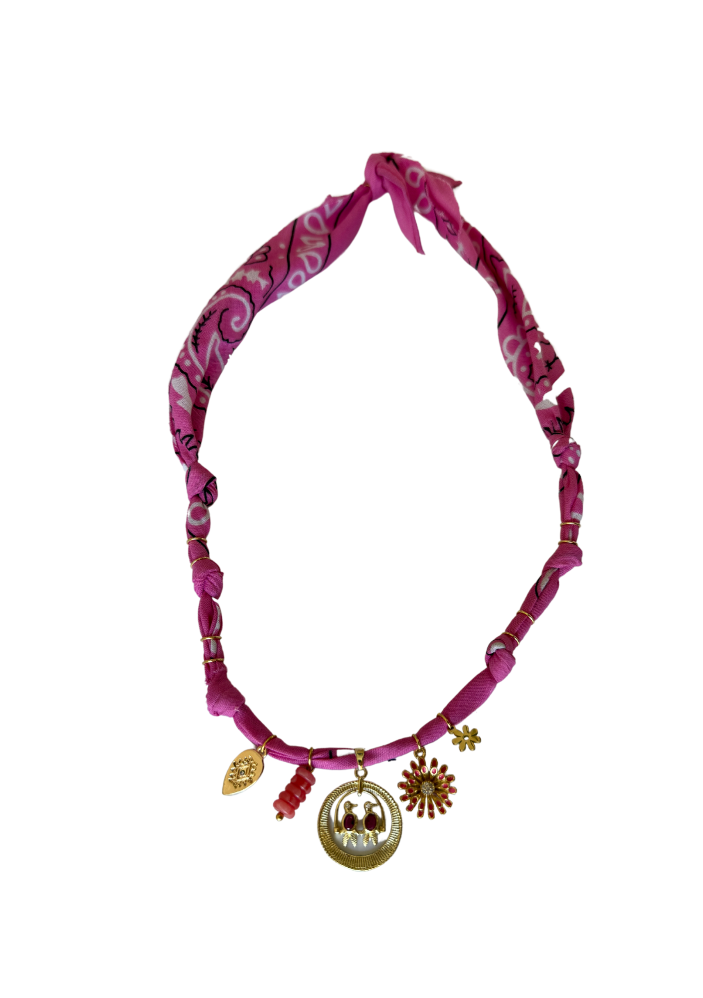 Conçu pour s’adapter à toutes vos humeurs, ce bijou façon bandana se décline en collier, bracelet ou bracelet de cheville. Tissé en coton pur et orné d’un motif en acier inoxydable serti de pierres naturelles, il incarne le style libre et affirmé.