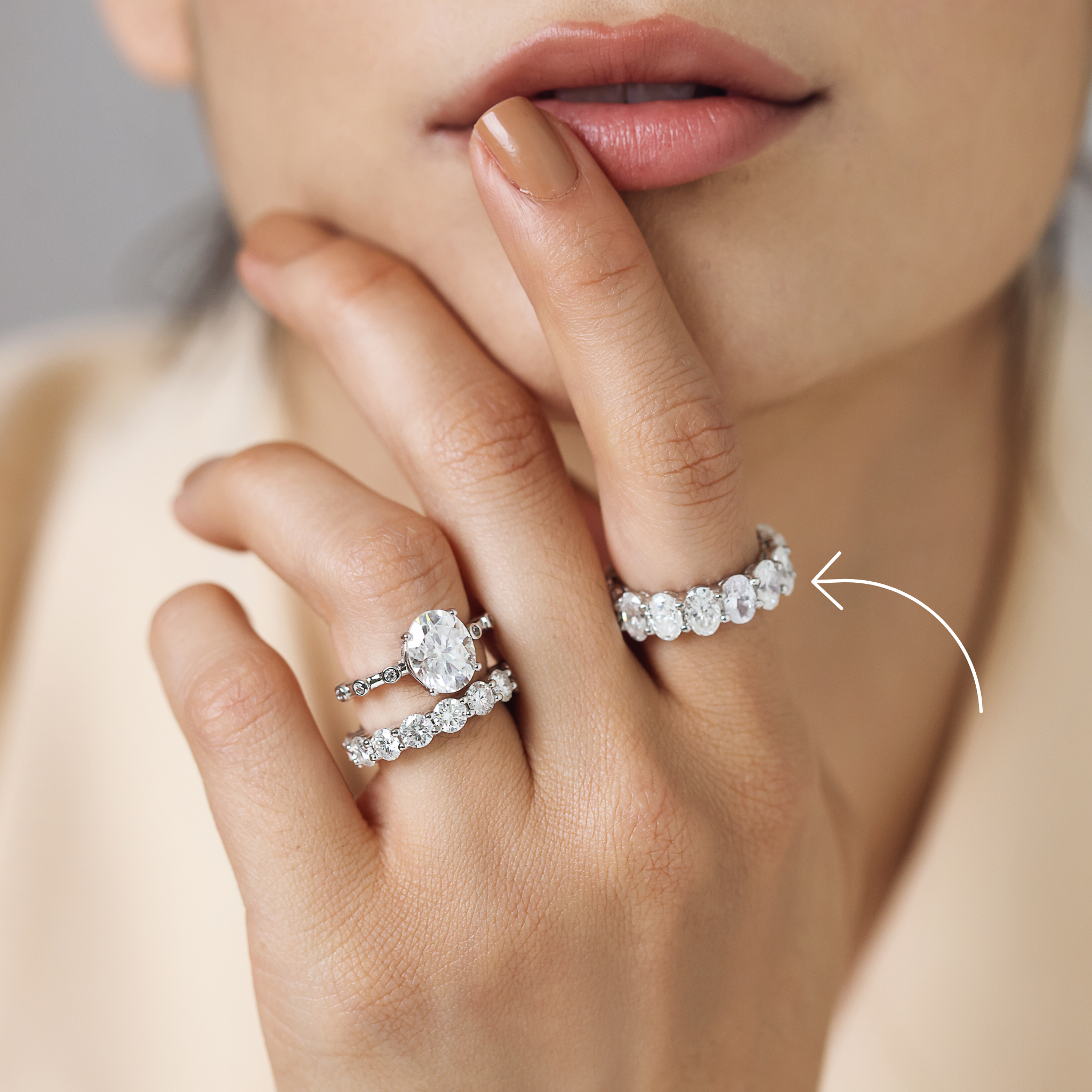 Élégante et éclatante, cette alliance se distingue par ses pierres moissanite taillées en forme ovale, sublimées par une finition argent trempé or. D’une brillance exceptionnelle, elle incarne l’alliance parfaite entre modernité et intemporalité.