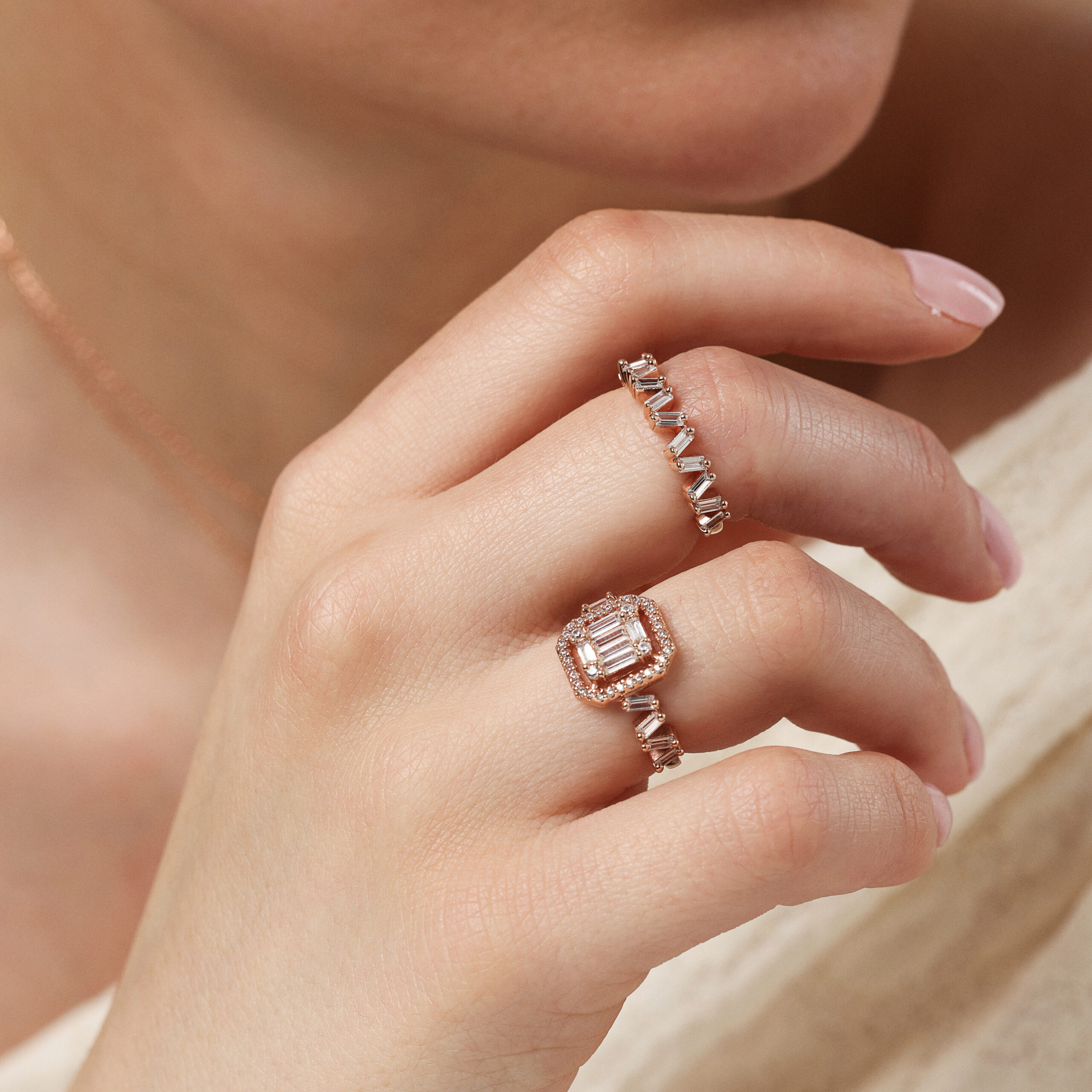 Une silhouette graphique et contemporaine, sublimée par l’éclat des diamélites 5A. Sa structure en zigzag crée un jeu de lumière raffiné, tandis que la finition en rose gold sur base argent trempé or apporte une touche de modernité. Un bijou audacieux et élégant à porter seul ou en accumulation.
