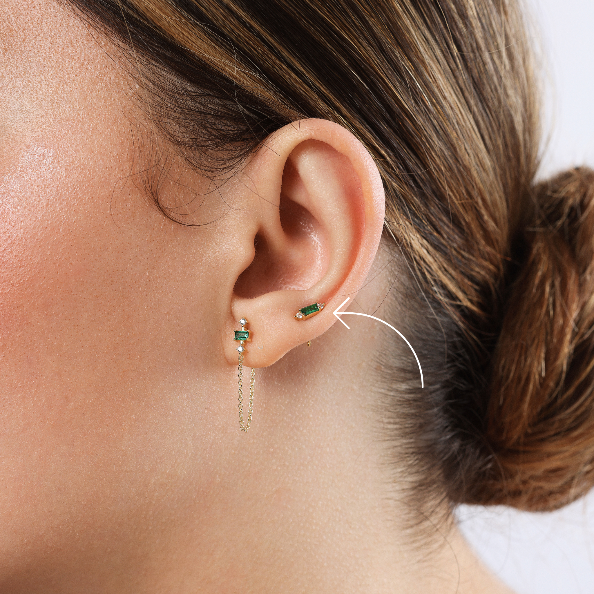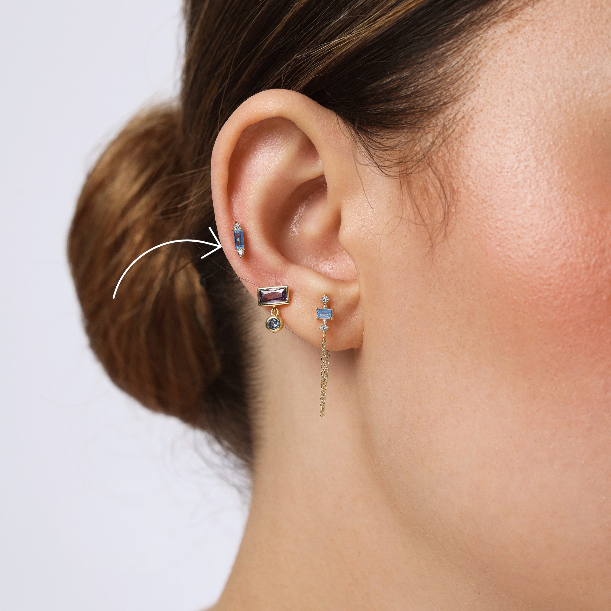 Ce piercing en forme de baguette allie élégance et subtilité avec ses pierres scintillantes rose, vert et bleu ciel, montées sur une base en argent trempé or.