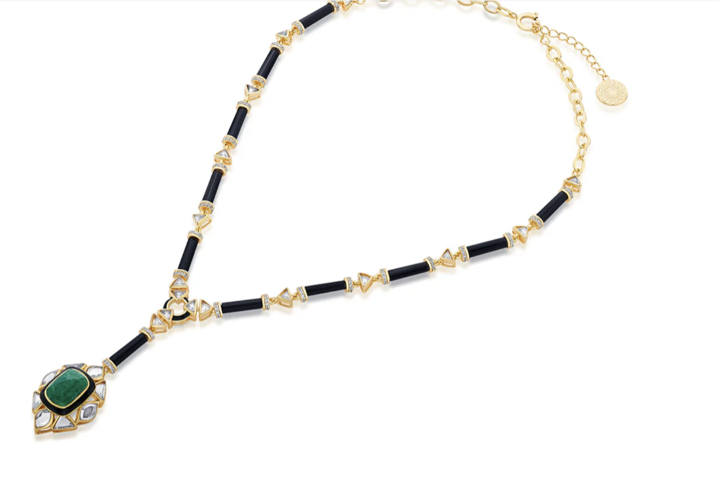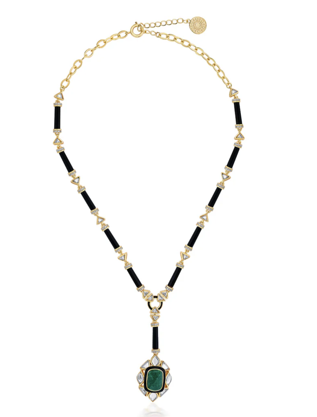 Collier Begum Haute Evergreen – Une pièce élégante mêlant l’éclat profond de l’onyx noir, la douceur du jade vert et la brillance des miroirs et zircons. Monté sur une base plaquée or 18 carats, ce collier allie richesse des textures et raffinement intemporel.