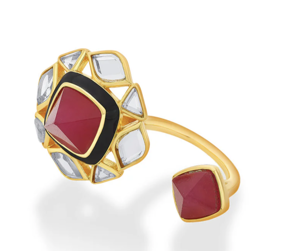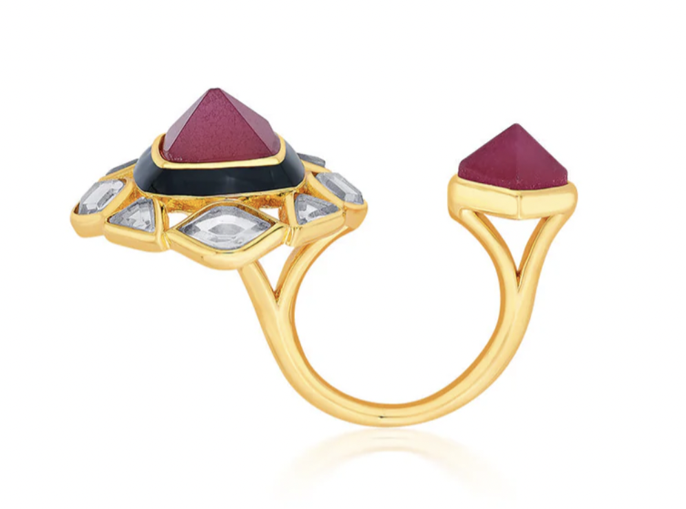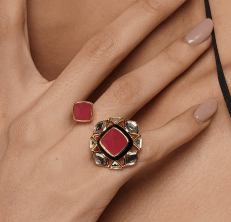 Bague Begum Haute Everpink – Une pièce élégante mêlant l’éclat profond de l’onyx noir, la douceur du jade rose et la brillance des miroirs et zircons. Monté sur une base plaquée or 18 carats, ce collier allie richesse des textures et raffinement intemporel.