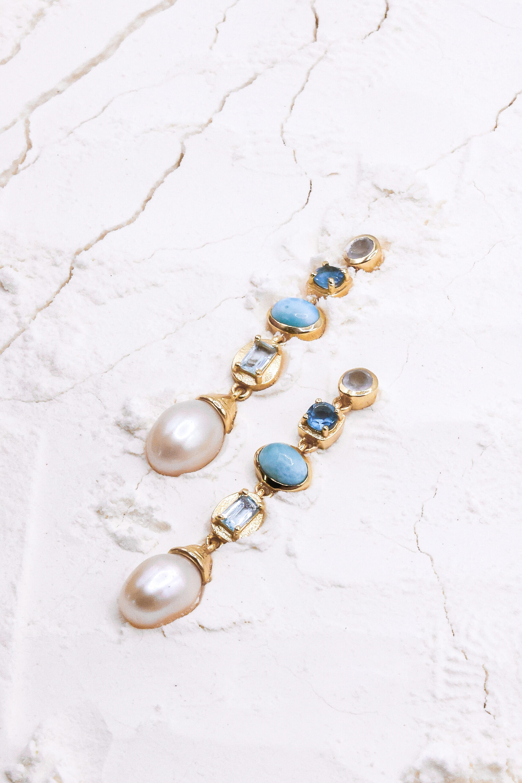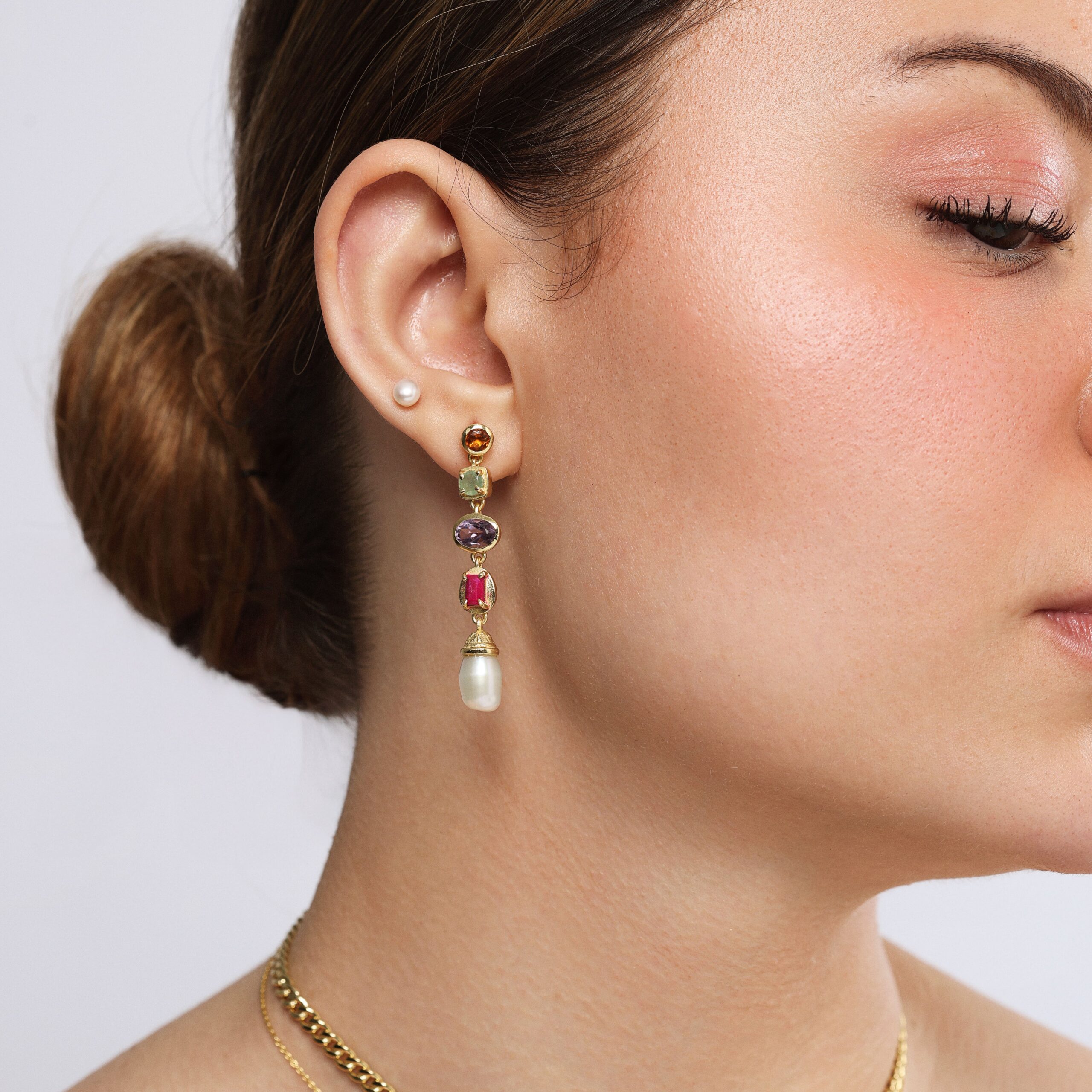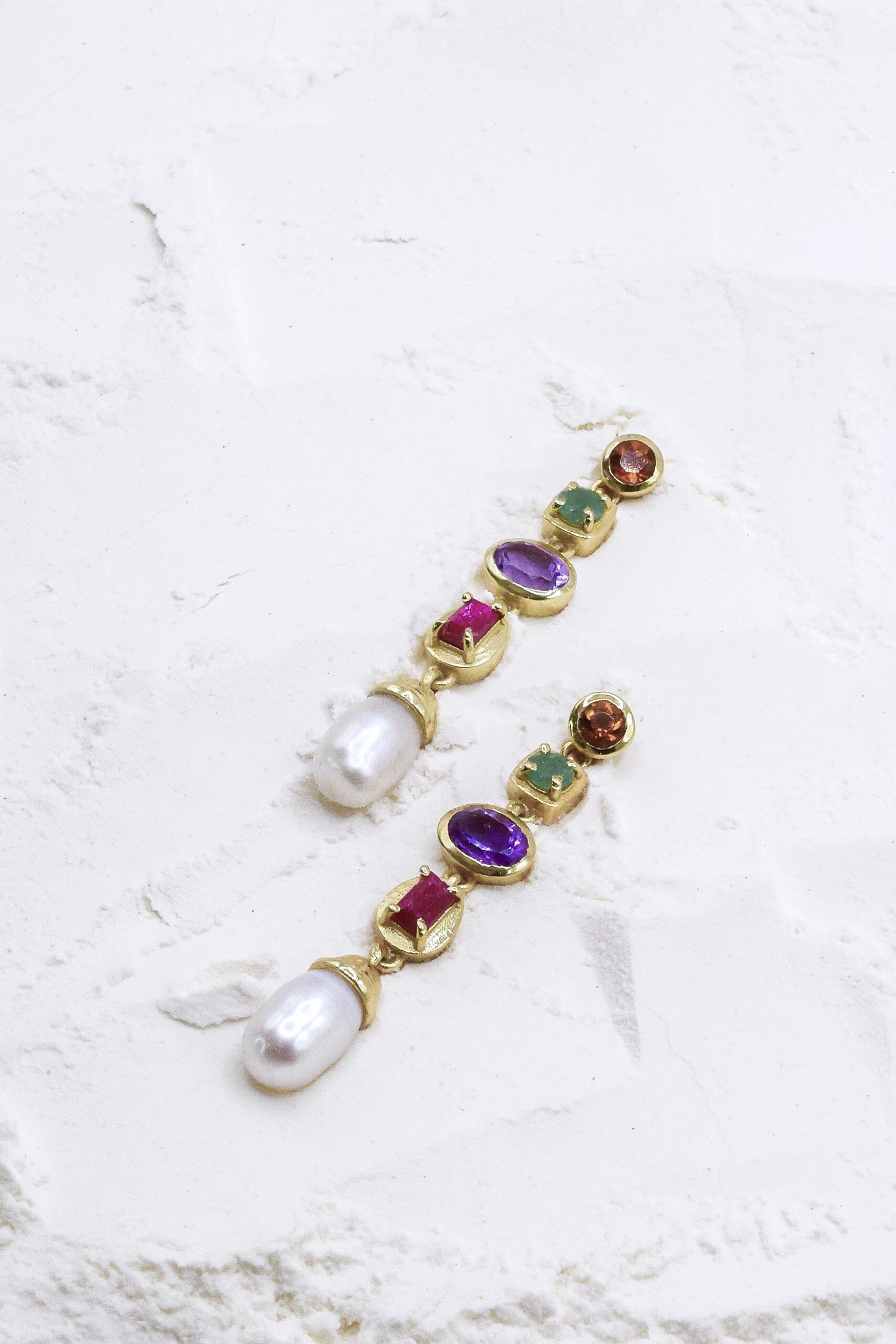 Un bijou poétique et coloré, inspiré de la nature. Ces boucles d’oreilles mêlent avec délicatesse des pierres fines (quartz, jade, améthyste, rubis) et des perles de culture, suspendues à une base dorée en argent trempé or. Chaque goutte capture la lumière pour un rendu éclatant et organique.