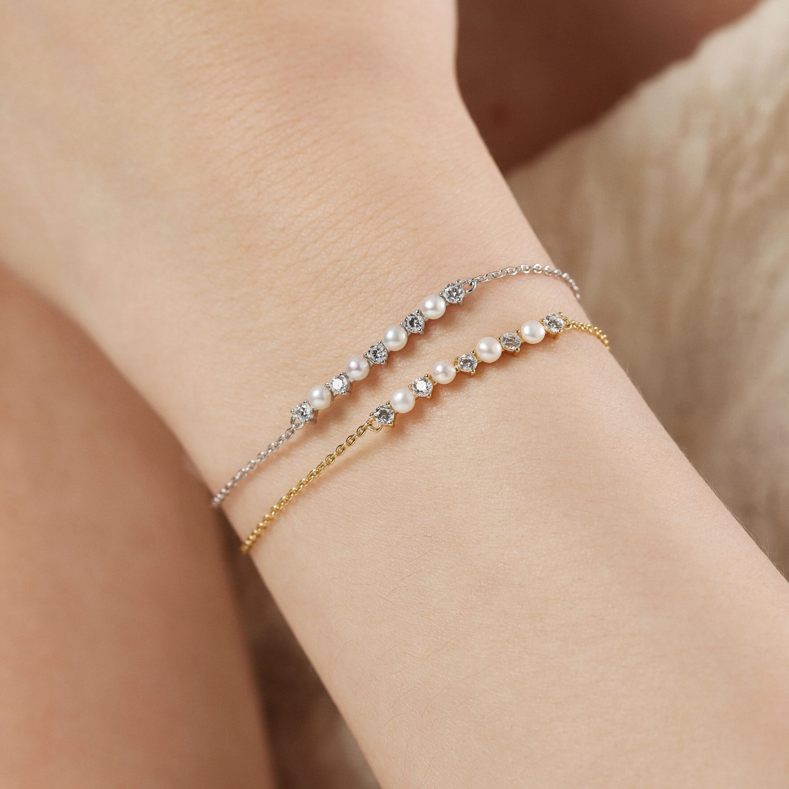 Cette gourmette allie la modernité à la délicatesse des perles de culture, le tout monté sur une base en argent trempé or. Disponible en finition or ou argent, il s’adapte à toutes vos envies.
