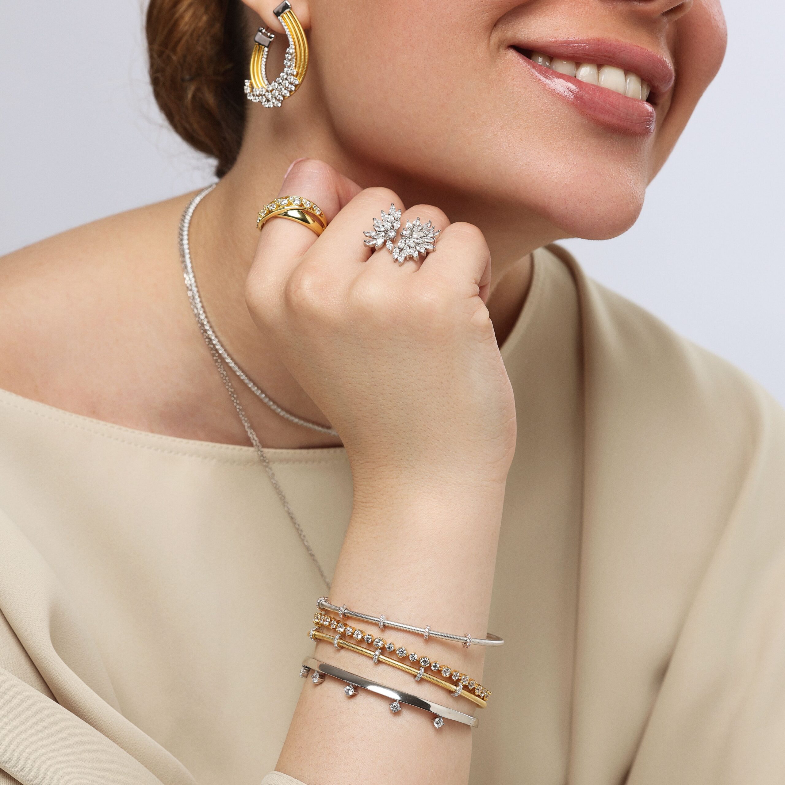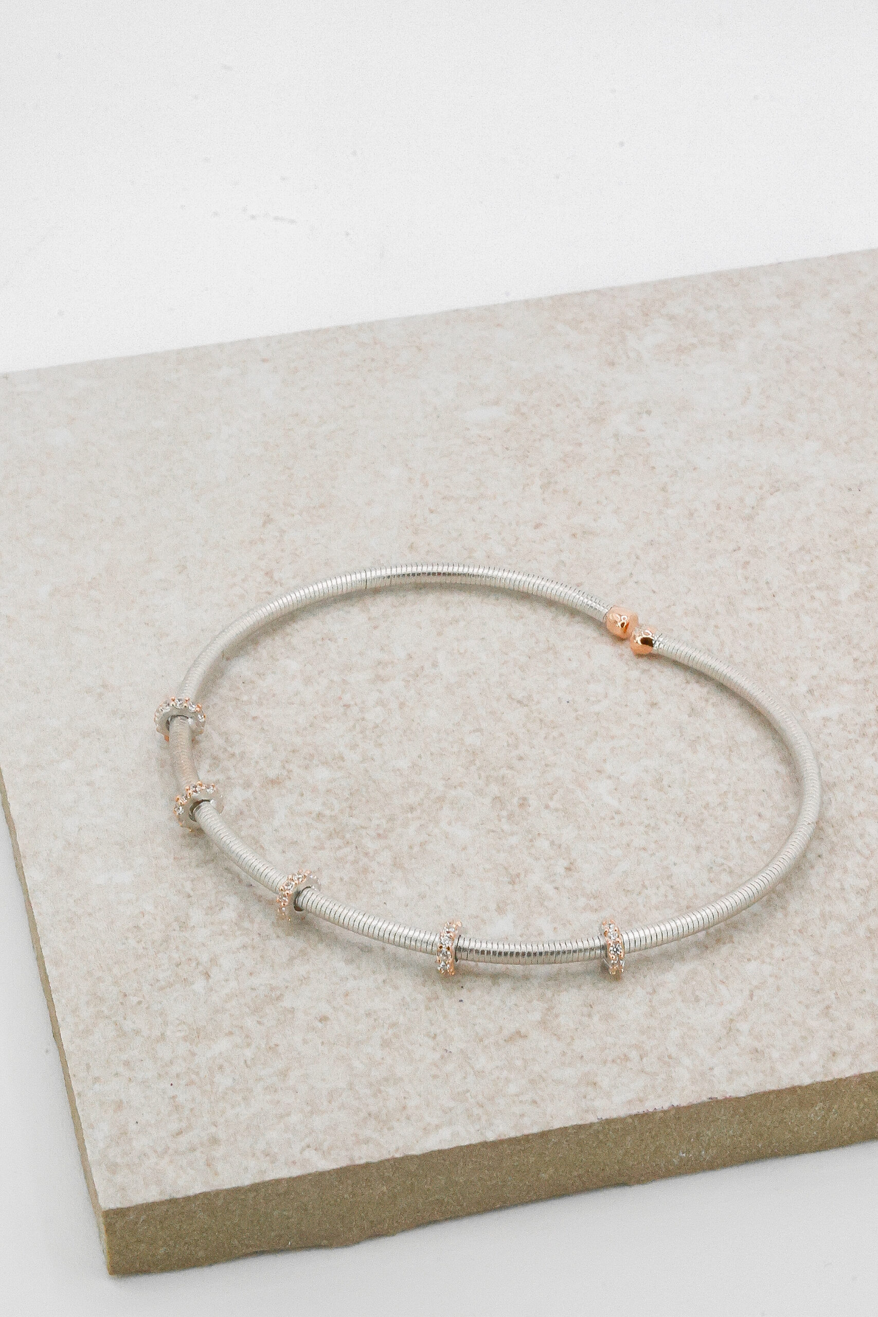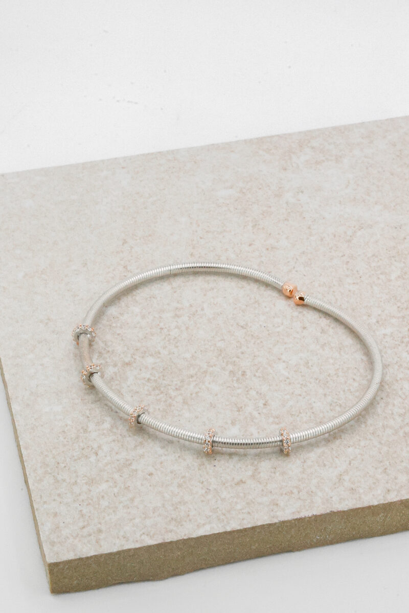 Sa forme souple et structurée épouse parfaitement le poignet, tandis que les finitions bi-color lui apportent une touche d’originalité raffinée. Proposé en version Or & Argent ou Argent & Rose Gold, chaque modèle est sublimé par une Diamelite 5A, pour une brillance élégante et durable. Un bijou polyvalent, à la fois discret et plein de caractère.