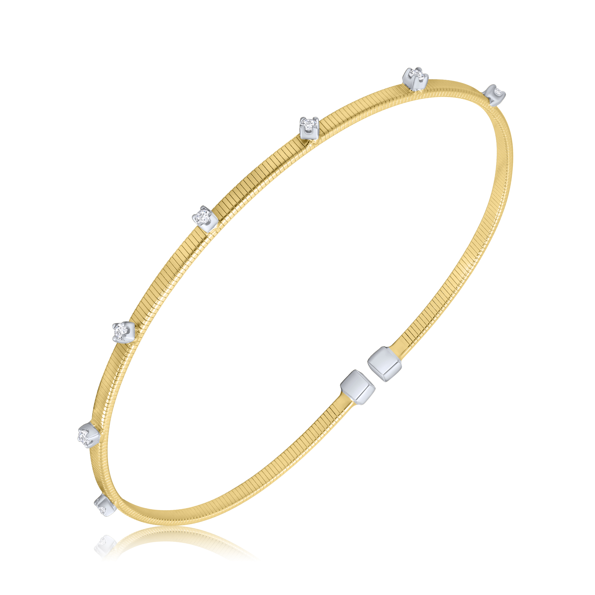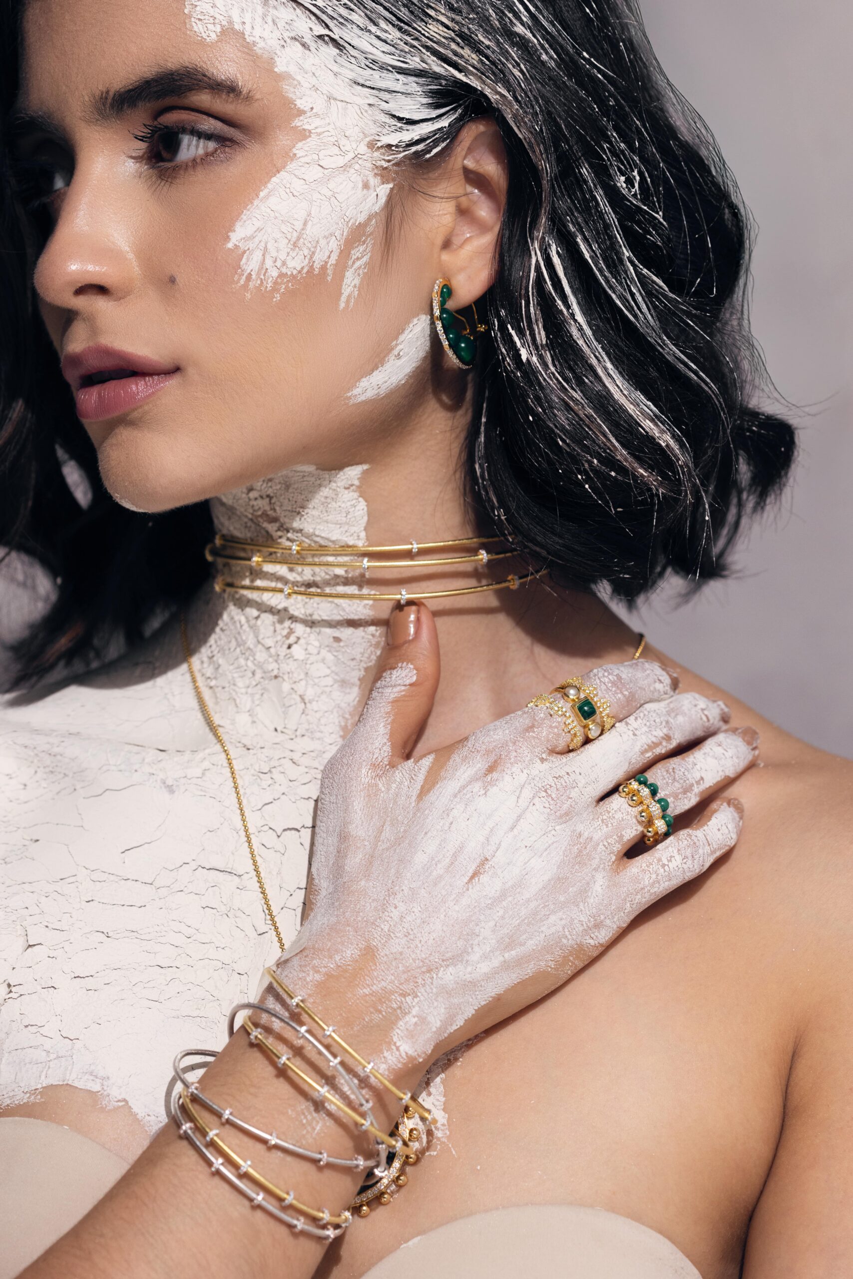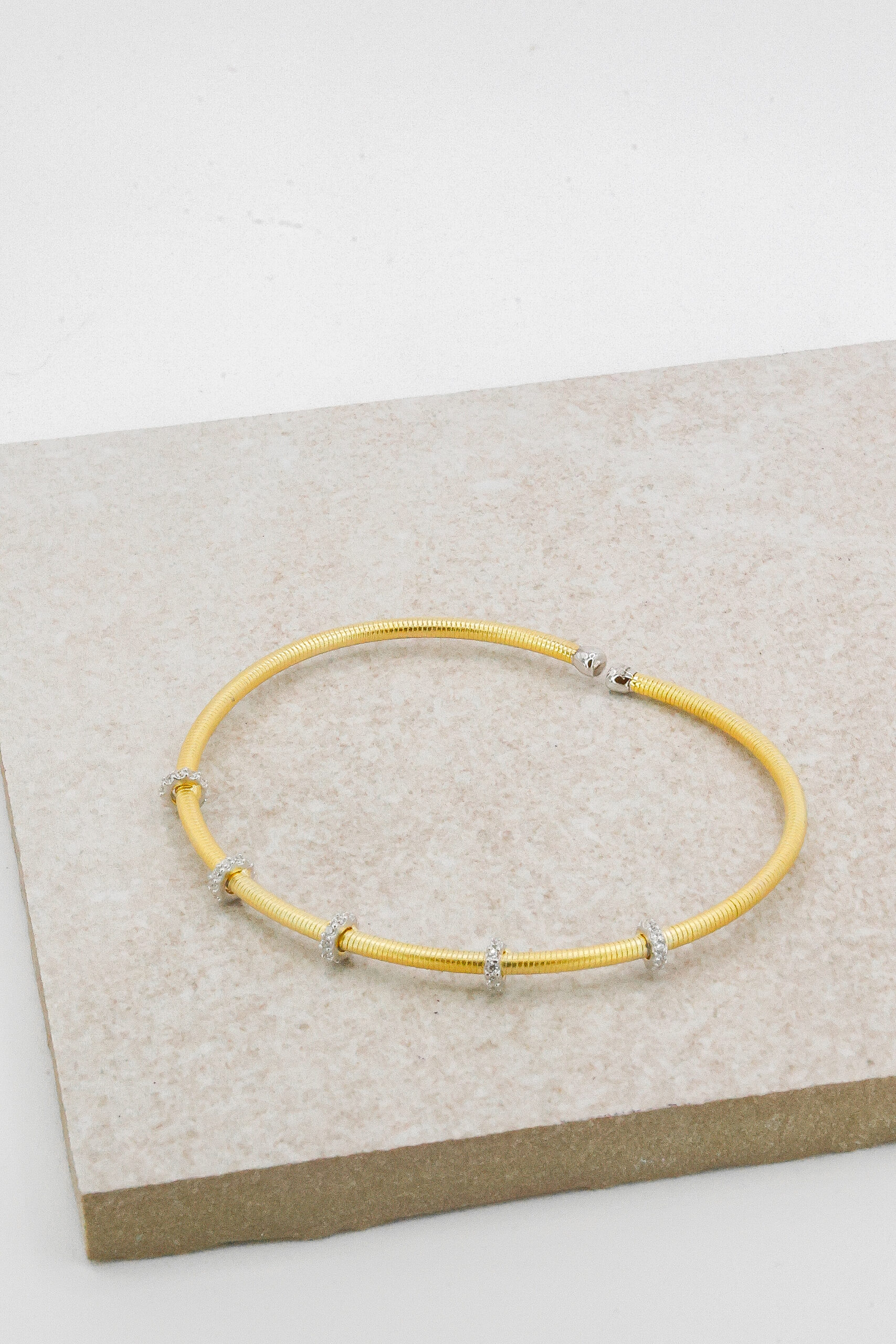Sa forme souple et structurée épouse parfaitement le poignet, tandis que les finitions bi-color lui apportent une touche d’originalité raffinée. Proposé en version Or & Argent ou Argent & Rose Gold, chaque modèle est sublimé par une Diamelite 5A, pour une brillance élégante et durable. Un bijou polyvalent, à la fois discret et plein de caractère.