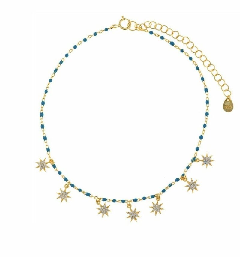 Chaînes de cheville Salvatore Plata — Raffinées et délicates, ces créations mêlent l’éclat doré de l’argent ,trempé or 18Ct, d’une fine maille à la fraîcheur des perles turquoises. Leur nuance rappelle les reflets de la mer au coucher du soleil, tandis que de petits motifs solaires, suspendus avec grâce, insufflent un charme lumineux à ce bijou baptisé Sunset