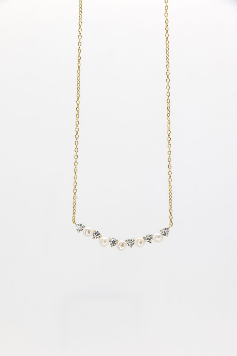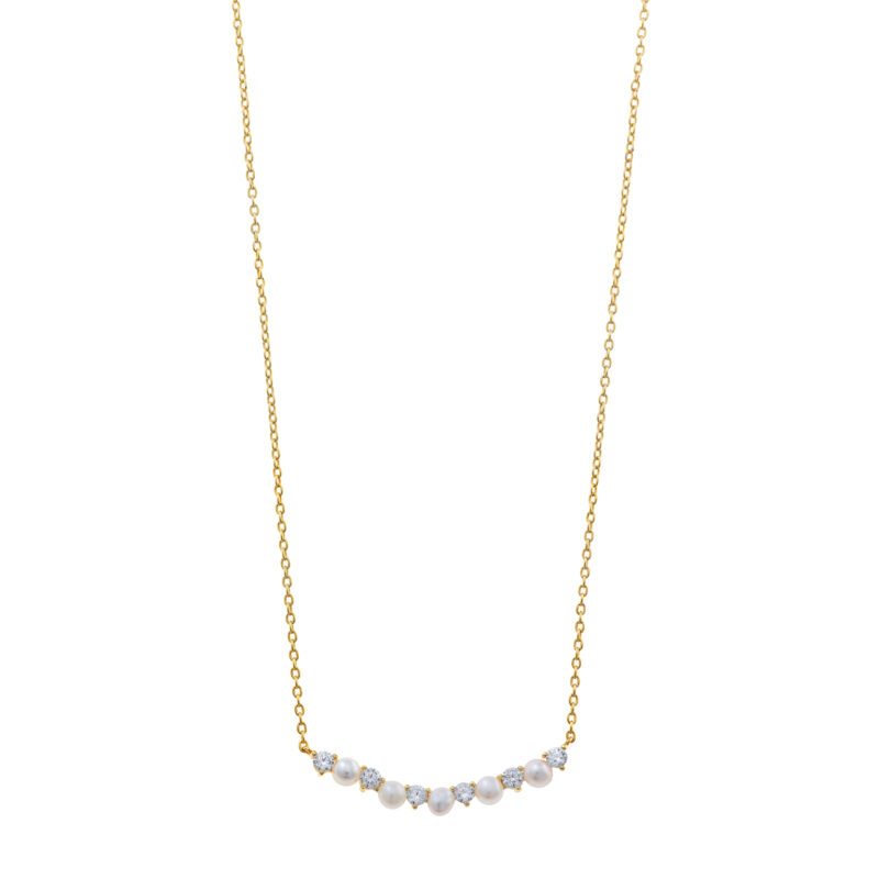 Délicat et raffiné, le Collier Barre Perlines associe l’éclat de la Diamelite 5A à la douceur intemporelle des perles de culture. Ses finitions dorées crée un équilibre parfait entre modernité et élégance. Conçu en argent trempé or, il illumine le cou avec subtilité.