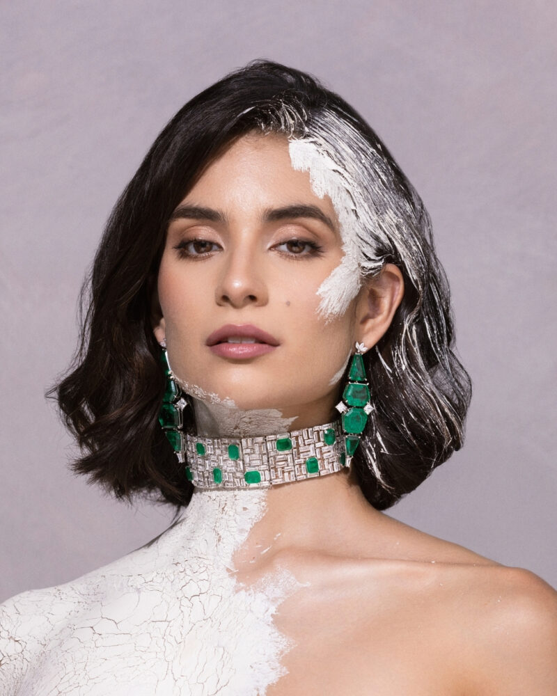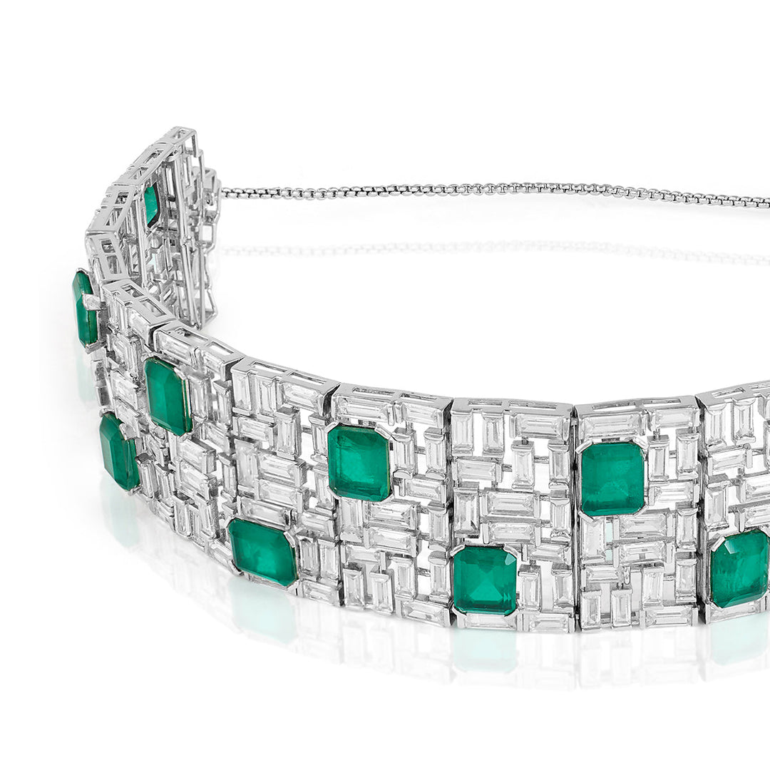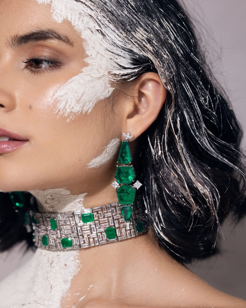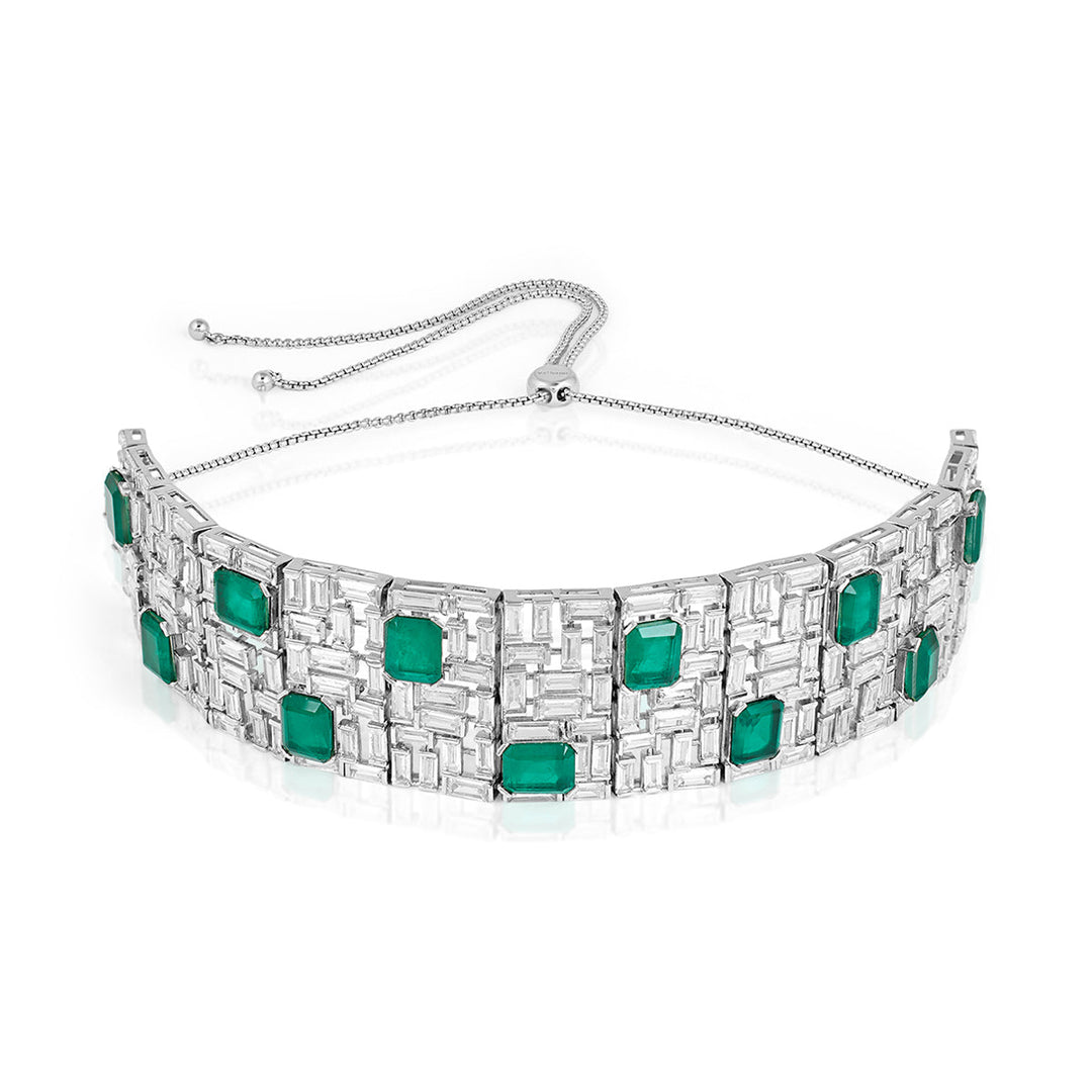 Collier Boly Isharya Green Emerald – Orné de somptueuses pierres Doublet Dark Emerald, ce collier associe la profondeur du vert émeraude à l’éclat des finitions en rhodium. Une création sophistiquée qui met en valeur la beauté des pierres naturelles avec une touche contemporaine.