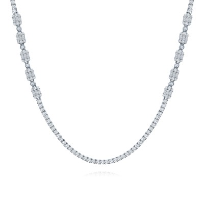 Raffinement et éclat s’unissent dans ce collier de style rivière composé de multiples pierres Diamelite 5A taillées en carré. Une pièce lumineuse et intemporelle, parfaite pour les grandes occasions.