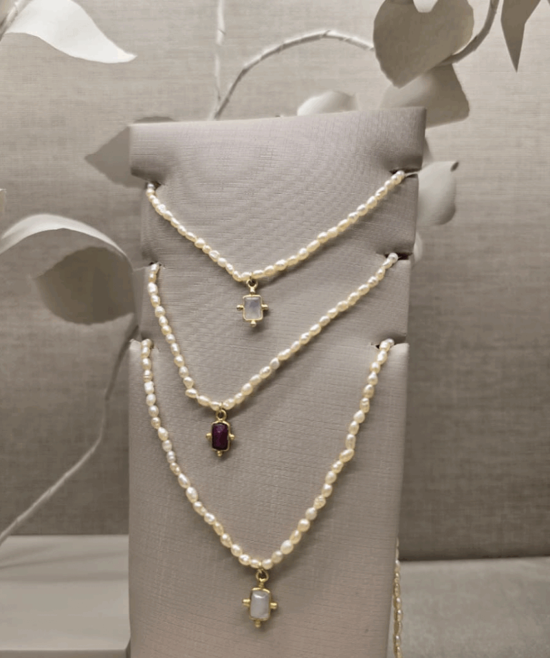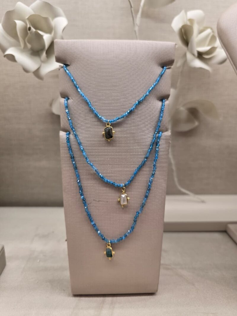 Une sublime creation en pierres naturelles, ornée de petits pendentifs délicats en pierre naturelle, disponible dans des nuances fraîches et rafraîchissantes. Idéale à porter seuls pour une élégance subtile ou en accumulation pour un look sophistiqué. Une touche parfaite de féminité, en harmonie avec la beauté authentique des pierres naturelles, conçue pour la femme moderne et élégante en quête de connexion avec la nature.