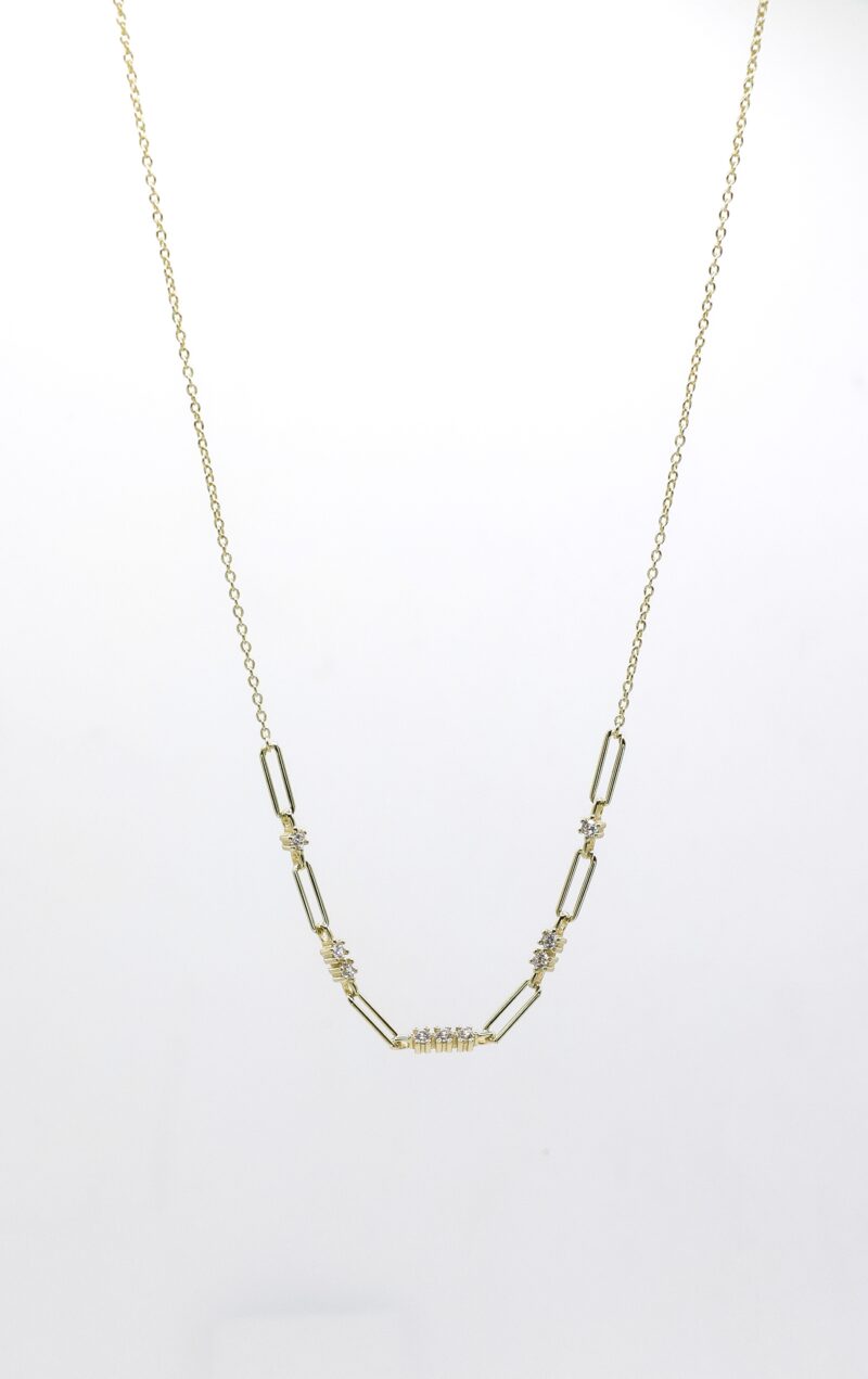 Un collier délicat au design irrégulier et moderne, où de fins maillons sertis de Diamelite 5A s’alignent avec subtilité. Disponible en argenté ou doré, il est réalisé en argent trempé or pour une finition lumineuse et durable. Un bijou chic et facile à porter, seul ou en superposition.