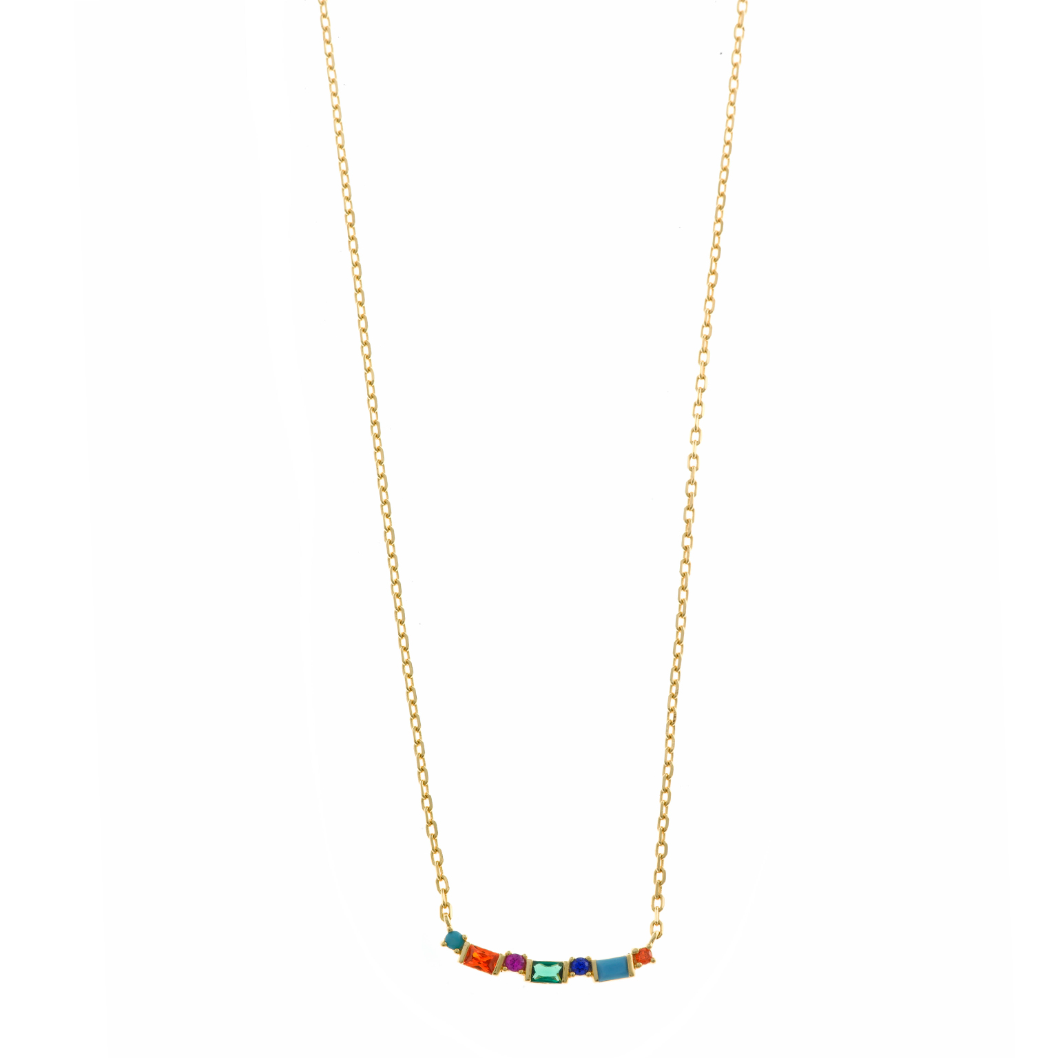 Un arc-en-ciel de lumière dans un format délicat. Ce collier raffiné allie la chaleur d’une base dorée à l’éclat coloré de pierres en baguettes. Chaque pierre, en Quartz thermal de qualité Diamelite 5A, est soigneusement taillée pour capter la lumière sous tous les angles.