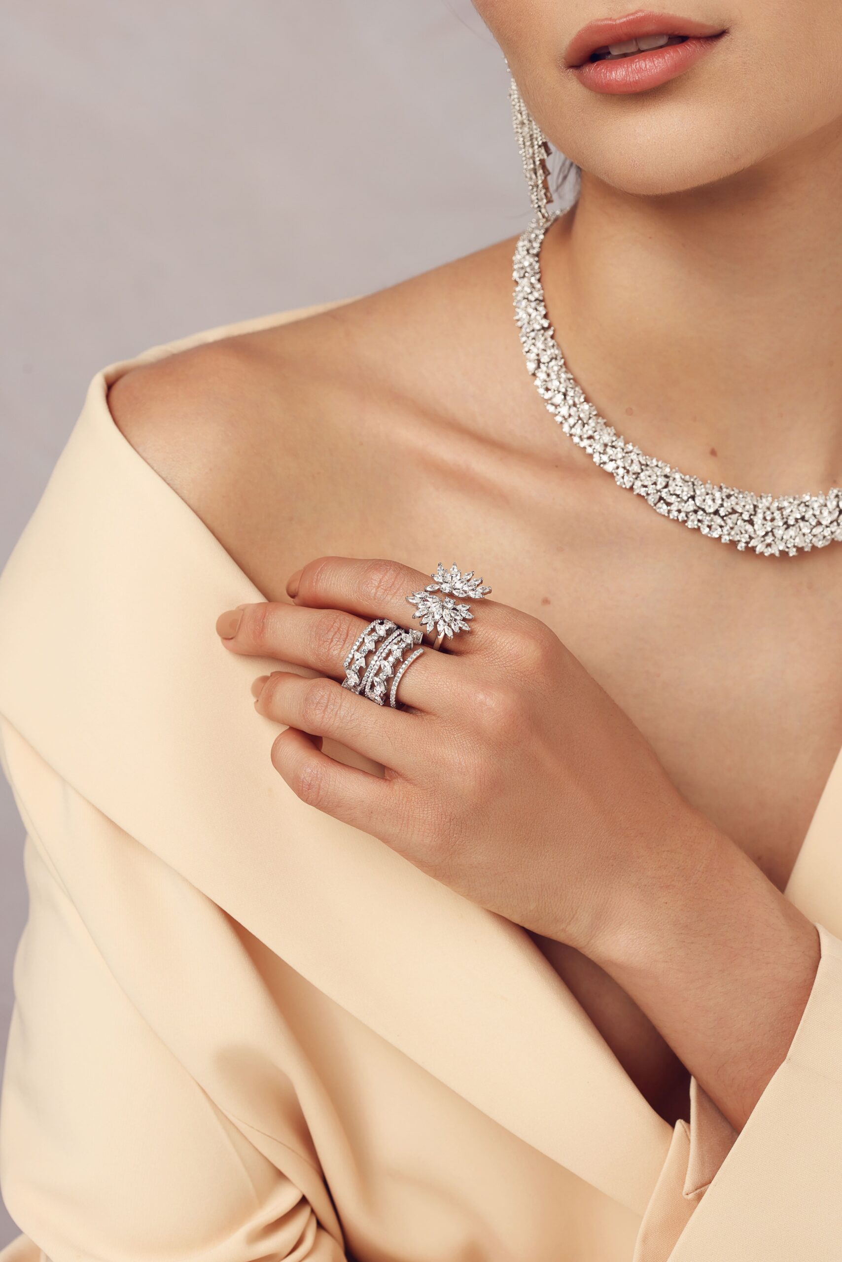 Majestueux et lumineux, Totalement en mouvement pour épouser parfaitement les courbes, le Collier Queen Bridal est une pièce forte qui sublime le cou avec élégance. Orné de Diamelite 5A aux reflets éclatants, il est conçu en argent trempé or avec une finition argentée raffinée. Idéal pour les grandes occasions ou pour rehausser une tenue avec une touche royale.