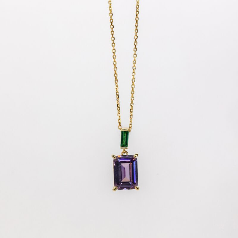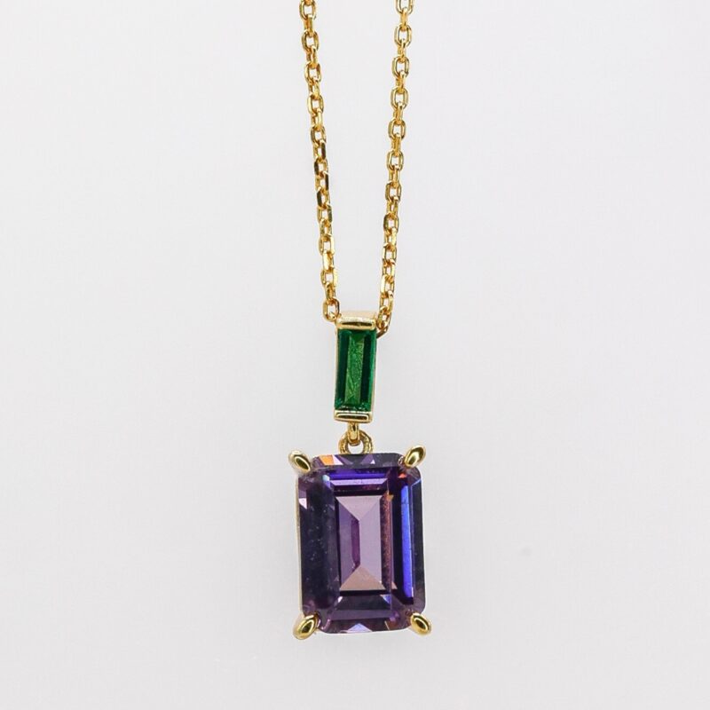 Son pendentif carré en quartz thermique mauve capte la lumière avec subtilité, tandis qu’une délicate pierre verte surmonte la composition pour une touche de contraste inattendue.