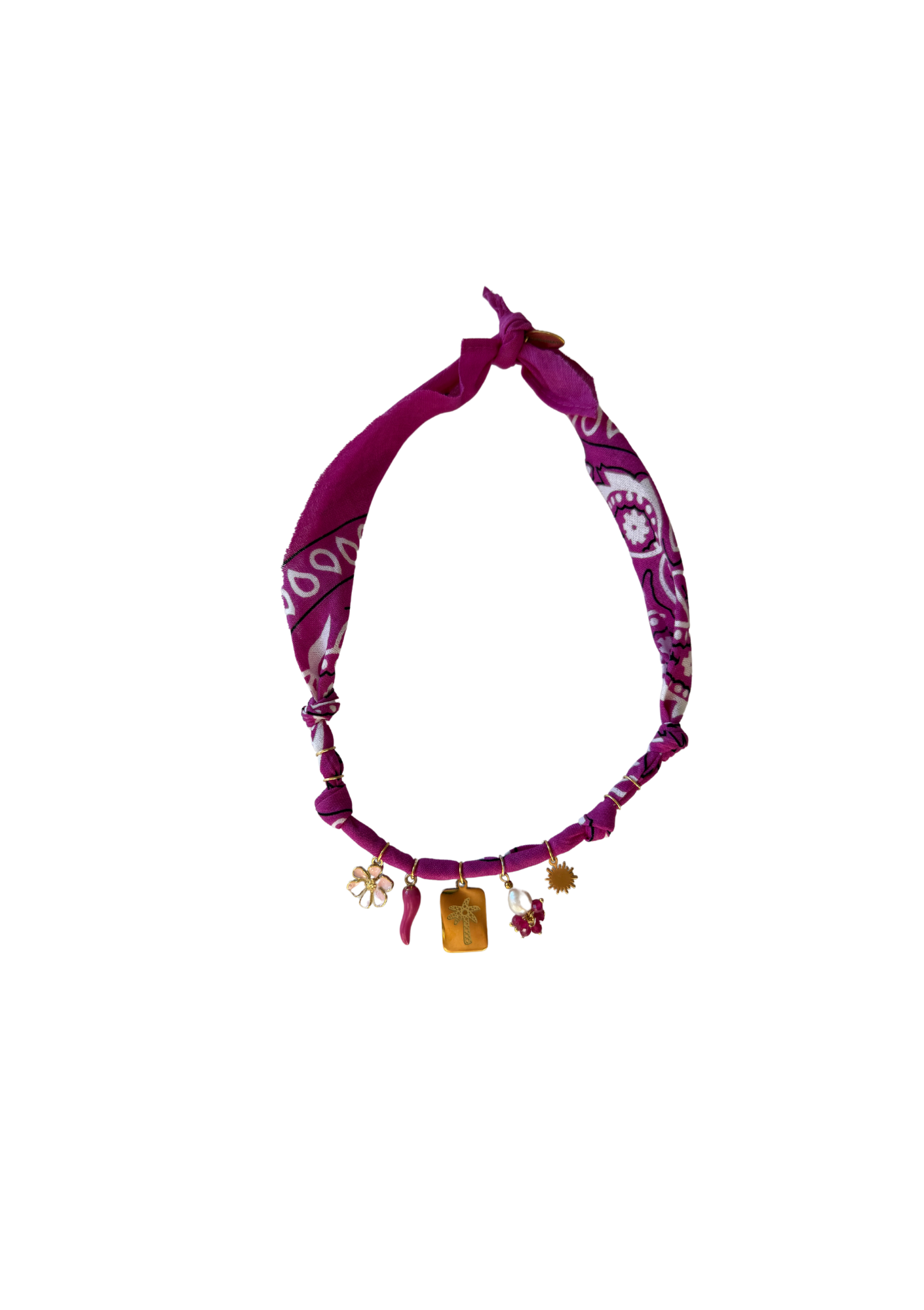 Accessoire multi-usage par excellence, ce bijou façon bandana se transforme à volonté en collier, bracelet ou cheville. Sa composition en coton pur, rehaussée d’acier inoxydable et de pierres naturelles, marie confort et élégance.