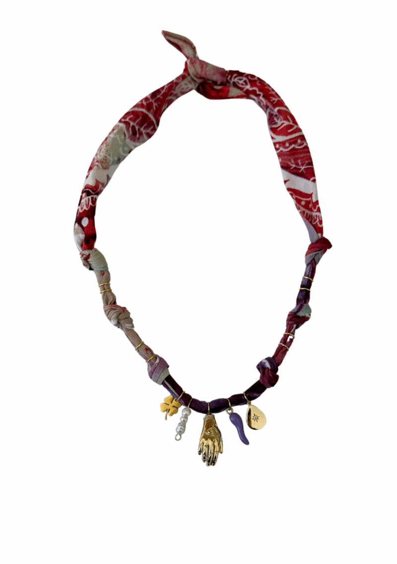 Collier, bracelet ou cheville : ce bijou inspiré du bandana s’adapte à toutes vos envies. Fabriqué en coton pur, orné d’acier inoxydable et pierres naturelles.