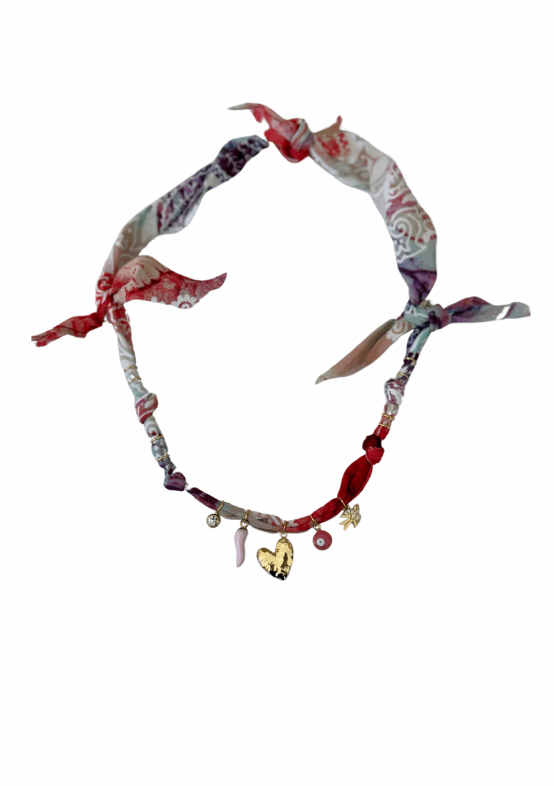 L’icône bandana revisitée en bijou modulable : collier, bracelet ou cheville. Coton 100%, motif acier inoxydable et pierres naturelles.