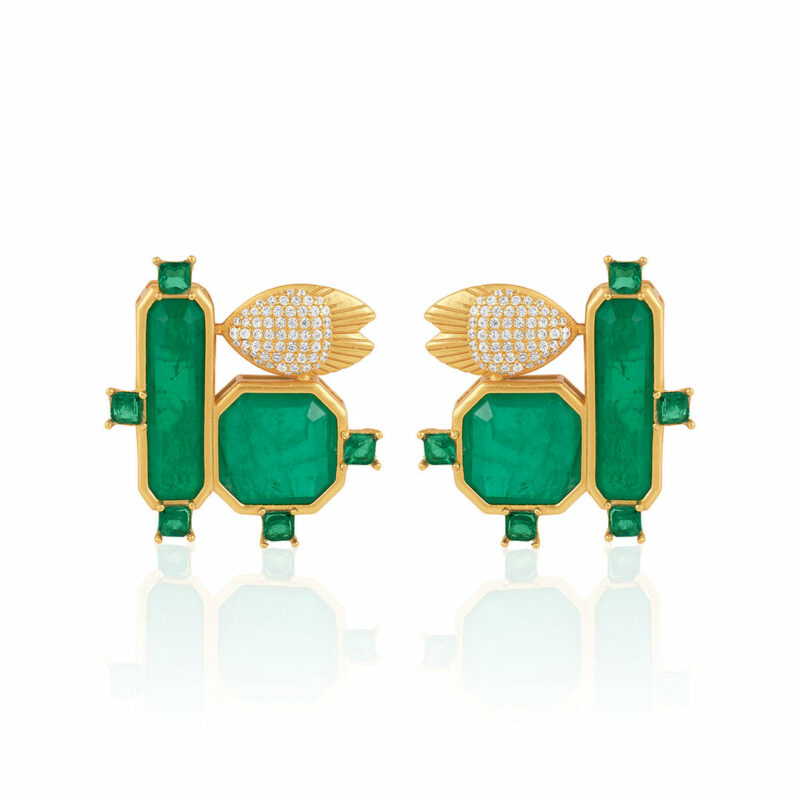 Boucles d’oreilles Isharya Vertes – Un design intemporel sublimé par un somptueux doublet vert émeraude foncé. La monture en rhodium plaqué or 18 carats, rehaussée d’un revêtement écologique, offre éclat et durabilité pour un bijou à la fois luxueux et raffiné.