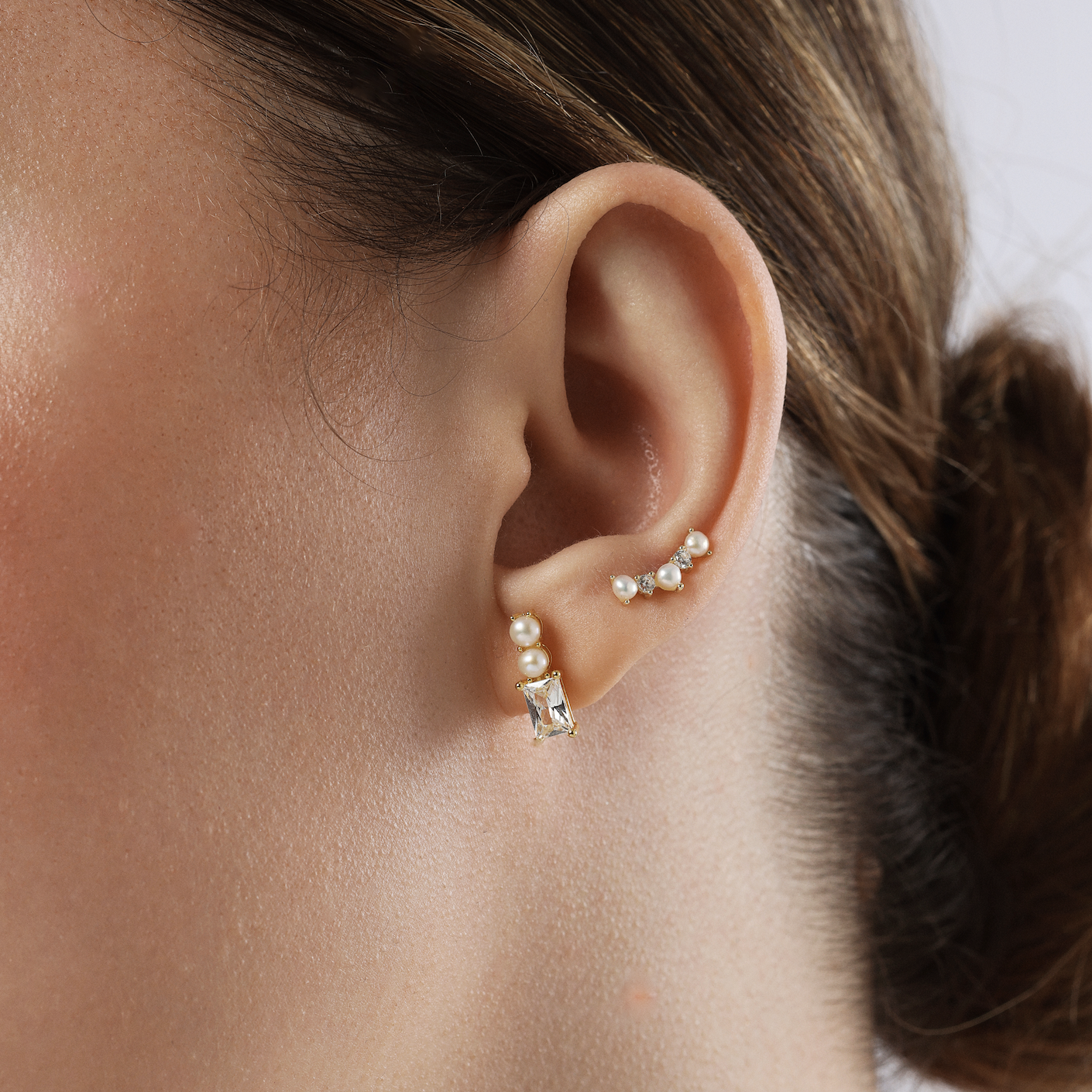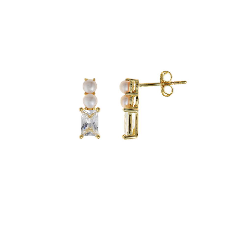 Mini Perline Mini Square – Un subtil mariage entre l’éclat doré et la douceur d’une perle de culture, sertie de Diamelite 5A pour une brillance raffinée. Conçue en argent trempé or, ces boucles délicates apportent une touche élégante et féminine à votre style.