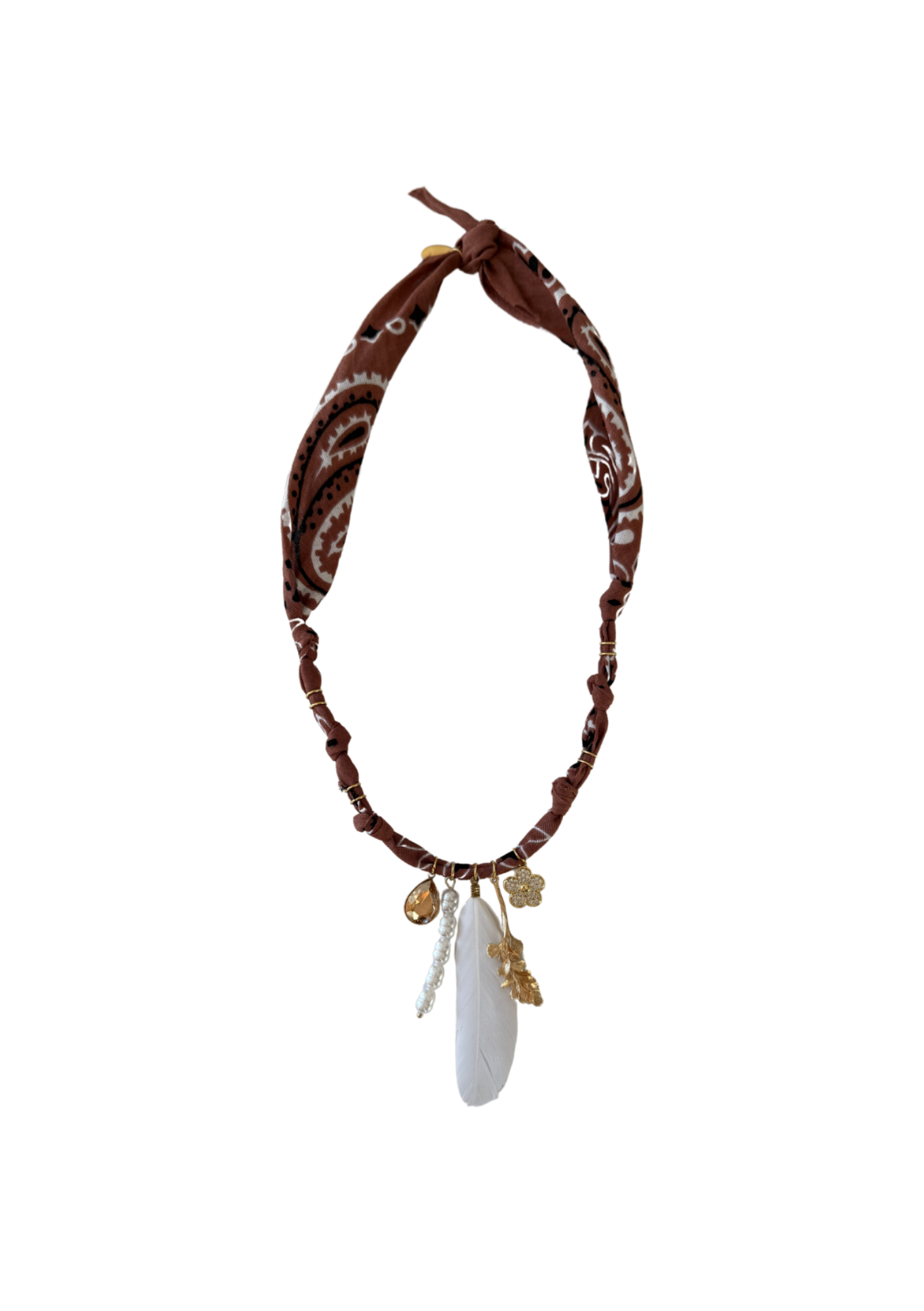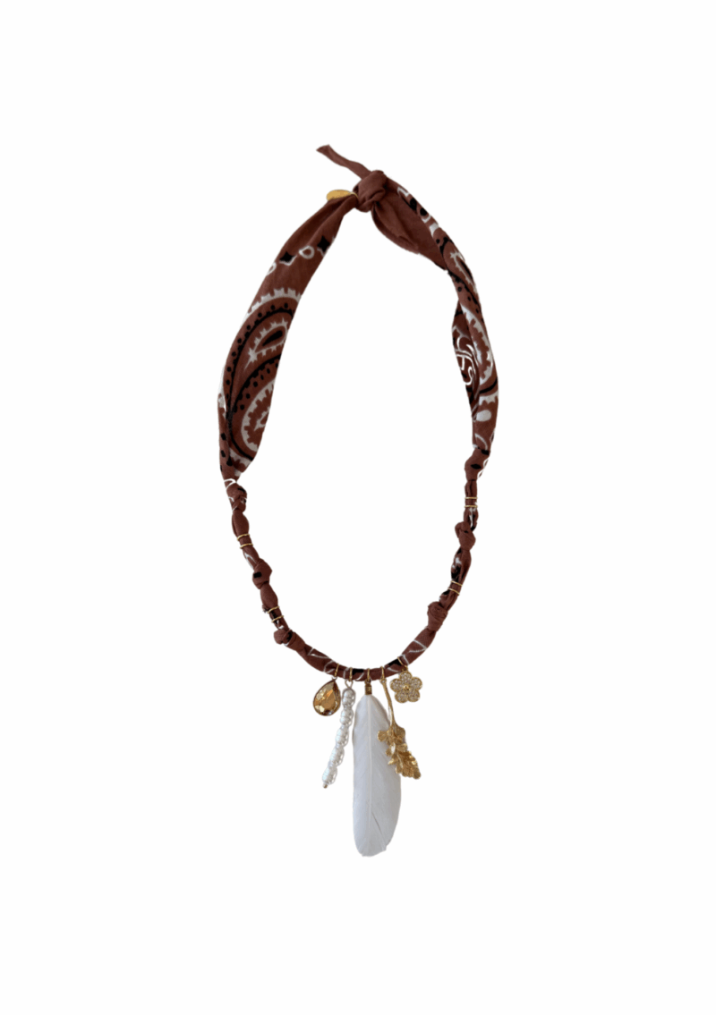 Bijou inspiré du bandana, à porter en collier, bracelet ou cheville. Coton 100%, acier inoxydable, pierres naturelles.