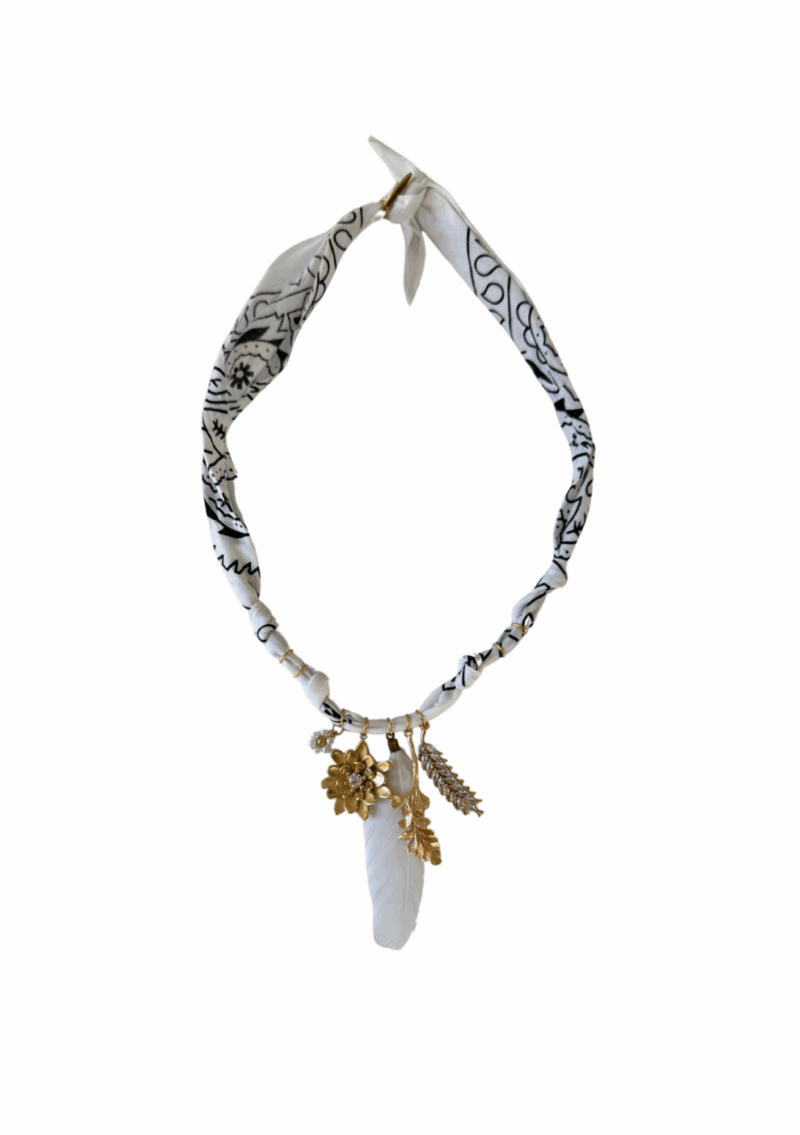Ce bijou bandana modulable se porte au cou, au poignet ou à la cheville. Coton pur et finitions acier inoxydable et pierres naturelles.