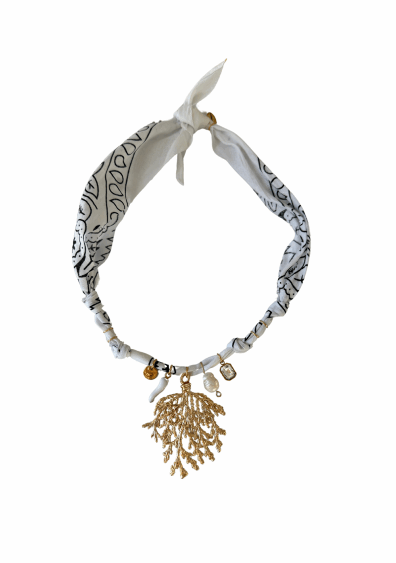 Coton 100%, acier inoxydable et pierres naturelles pour un bijou bandana aux trois usages.
